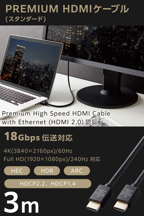 最大4K/60Hzの解像度に対応したHDMIケーブルです。Premium High Speed HDMI Cable with Ethernet認証済みで、映像信号と音声信号に加え、100Mbpsのイーサネット通信を実現します。明暗差を活かした立体感のある映像を伝送することができるHDRに対応しています。
