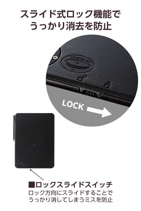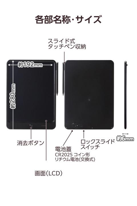 書いて消して繰り返し使える、12インチのデジタルメモパッドです。メモだけでなく、イラストやお子さんのお絵かきにも使える大画面。はめ込みタイプの筐体設計と強度の高いフィルムで、耐久性に優れた長く使える本体構造です。付属の専用タッチペンは持ちやすい丸型形状で、ペン先は細く、細かい字もなめらかに書けます。![]() ■書いて消して繰り返し使える、12インチのデジタルメモパッドです。 ■メモだけでなく、イラストやお子さんのお絵かきにも使える大画面の12インチです。 ■ワンタッチで画面消去が可能。本体中央のボタンを押すだけで、書いたものを簡単に消せます。 ■スライド式のロック機能が搭載されているので、ボタンをスライドするだけで大切な情報をうっかり消してしまうミスを防ぎます。 ■はめ込みタイプの筐体設計と強度の高いフィルムで、耐久性に優れた長く使える本体構造です。フィルムやボタンは10万回の耐久テストで検証済みです。 ■付属の専用タッチペンは持ちやすい丸型形状で、ペン先は細く、細かい字を書きやすい形状です。 ■本体側面の溝にスライドさせてタッチペンの固定が可能です。 ■コイン形リチウム電池1個で使用可能で、交換も簡単です。 ■自社環境認定基準を1つ以上満たし、『THINK ECOLOGY』マークを表示した製品です。 ■環境保全に取り組み、製品の包装容器が紙・ダンボール・ポリ袋のみで構成されている製品です。 ![]() ■収納時サイズ:幅約280mm×高さ約192mm×奥行約6mm ■重量:約210g(電池含む) ■材質:ABS(電子パッド筐体)、POM(ペン先)、ABS ■使用電池:CR2025 ■連続動作時間:約50時間 ■想定使用可能日数:約300日 ※1日の消去回数が約20回の場合 ■内容物:デジタルメモパッド本体、テスト用電池(装着付属) ■カラー:ブラック |