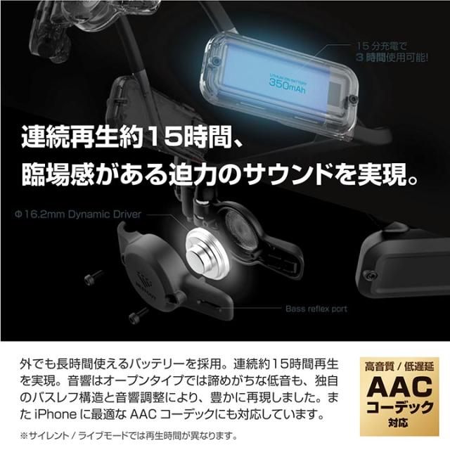 アウトドアに最適!自然の音や会話も一緒に楽しめるオープンイヤー型ウェアラブルスピーカー。 デバイス同士でシェアができるので周りを気にせず複数人の仲間と音楽を楽しむことができます。 大型ダイナミックドライバーと独自のバスレフ構造で迫力の音響体験を実現しました。