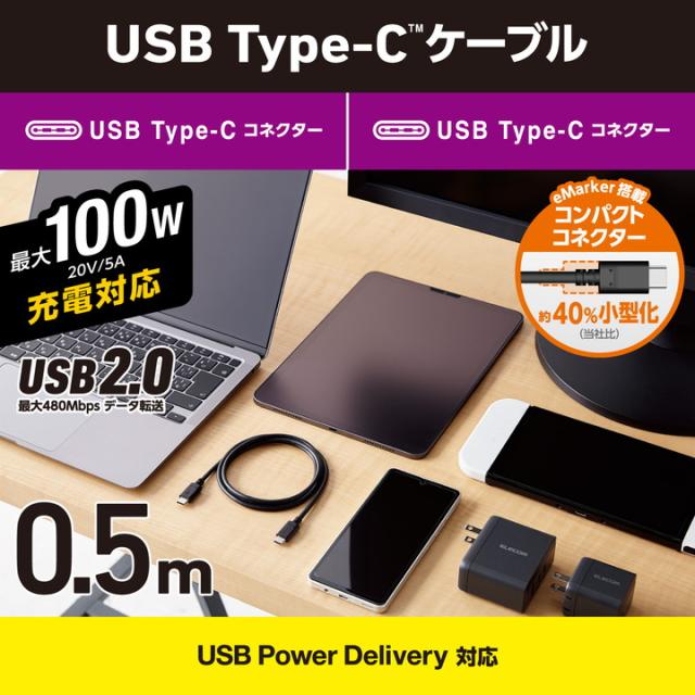 【在庫処分・お買い得!】 エレコム USB Type-C ケーブル USB PD対応 100W Type-C to Type-C 0.5m ブラック┃MPA-CC5P05BK