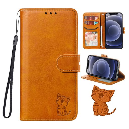 SENNWAK IPHONE 12 ケース 手帳型 IPHONE12 手帳ケース 猫柄 スマホケース ストラップ付き カード収納 ベルトマグネット スタンド機能 薄型 耐衝撃(IPHONE 12/12 PRO 6.1 INCH 対応) ライトブラウン
