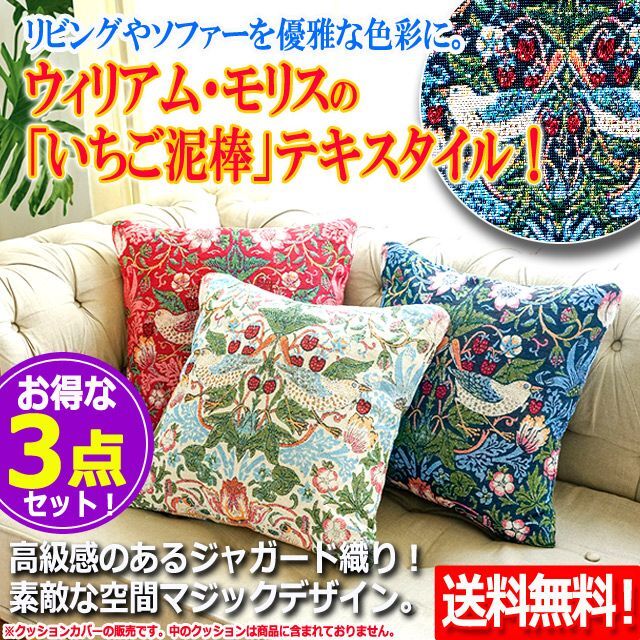ウィリアム・モリスの「いちご泥棒」ジャガード織りクッションカバー[3点] (OL お姉さん プレゼント テキスタイル セレブ オシャレ 優雅)