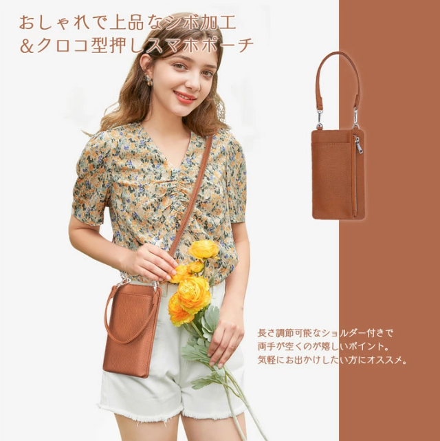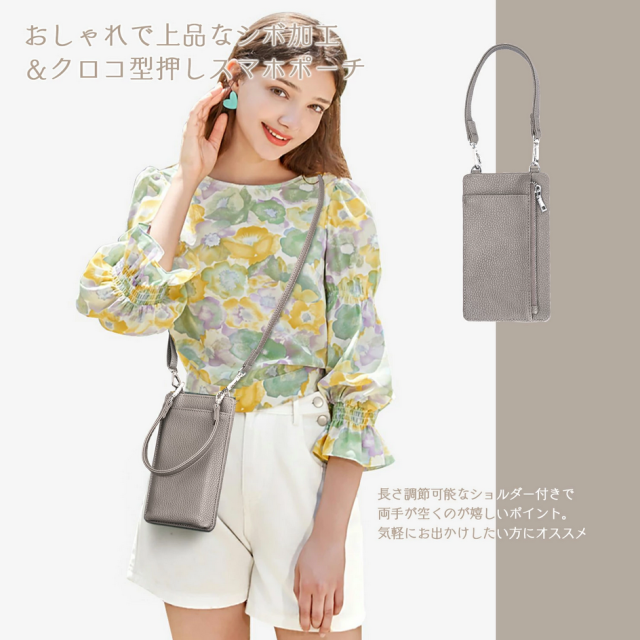 商品説明・おしゃれで上品なシボ加工&クロコ型押しスマホポーチ。 スマホポケットはオープンタイプ。 サッと取り出してすぐ使えます。 ポーチ背面にはファスナー付きポケット。 ちょっとした小物やお札を入れたりお財布代わりにも◎長さ調節可能なショルダー付きで両手が空くのが嬉しいポイント。 とっても機能的なスマホポーチ ショルダー。 高級感のあるクロコ型押しデザインが大人な表情。 これひとつでお出かけ可能。 ちょっとしたお出かけや様々なシーンで大活躍。 |