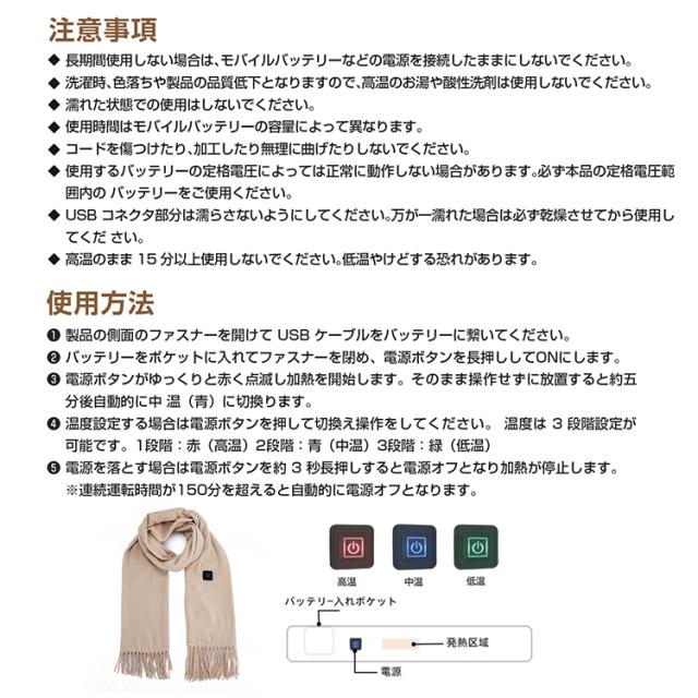 - バッテリーの重さを感じるし、マフラーがどんどん締まって苦しい。 上手く温かい部分を首に当てるのは難しい。 普通のマフラーとして使うには熱線が硬くて邪魔。