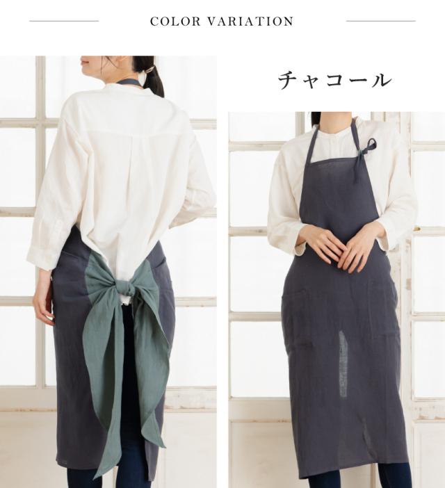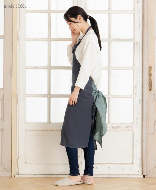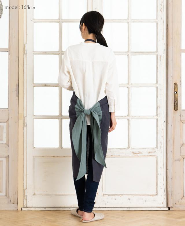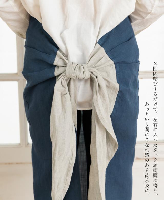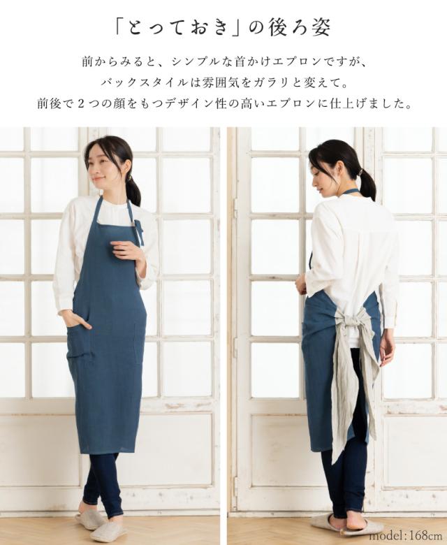 前から見るとシンプルに、バックスタイルはガラリと雰囲気を変えて「とっておき」の後ろ姿に。他と被らない、前後で2つの顔を持つデザイン性のあるエプロン。腰ひもを2回固結びすると、左右のタックが綺麗に入り、あっという間にこなれ感のある後ろ姿に。香川県の縫製工場で作るエプロンは、大切な方へのプレゼントにおすすめです。