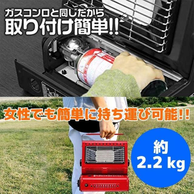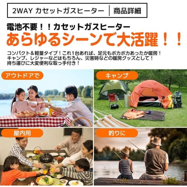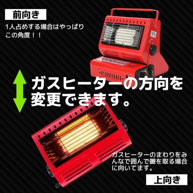 点火してすぐ温まるようになりました! これ1台あれば、足元もポカポカあったか暖房! カセットボンベ式のガスストーブです。 キャンプ・レジャーなどはもちろん、災害時などの暖房グッズとして! 持ち運びに大変便利な取っ手付! 温度・角度調整付! 市販のガスボンベ1本に付き約3時間の使用ができます。(使用状況により異なります) 電池不要設計で、緊急時にも安心! キャンプや釣り、スポーツ観戦などのアウトドアに。 地震、津波、竜巻、などの非常災害時の備えに