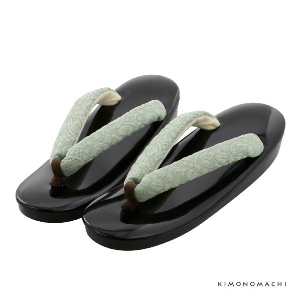 【色柄】鼻緒はアラベスク調の模様が織り出されたややグレイッシュなミントブルー。裏地はアイボリー。前坪は茶色。台は黒色。