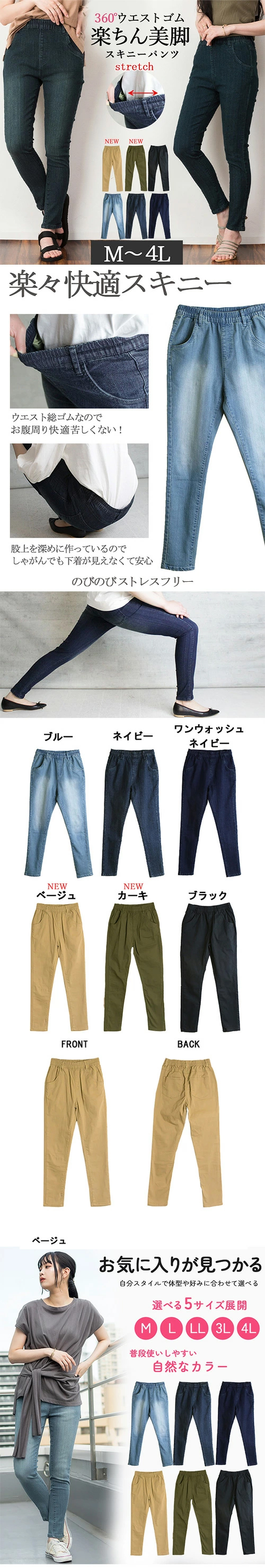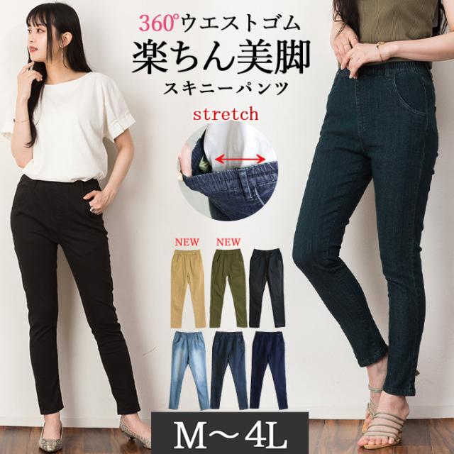 春新作 美脚スキニーパンツ ウエストゴム パンツ スキニー ストレッチデニム 美脚パンツ レディース 大きいサイズ M L LL 3L 4L 黒 ブルー ネイビー ベージュ