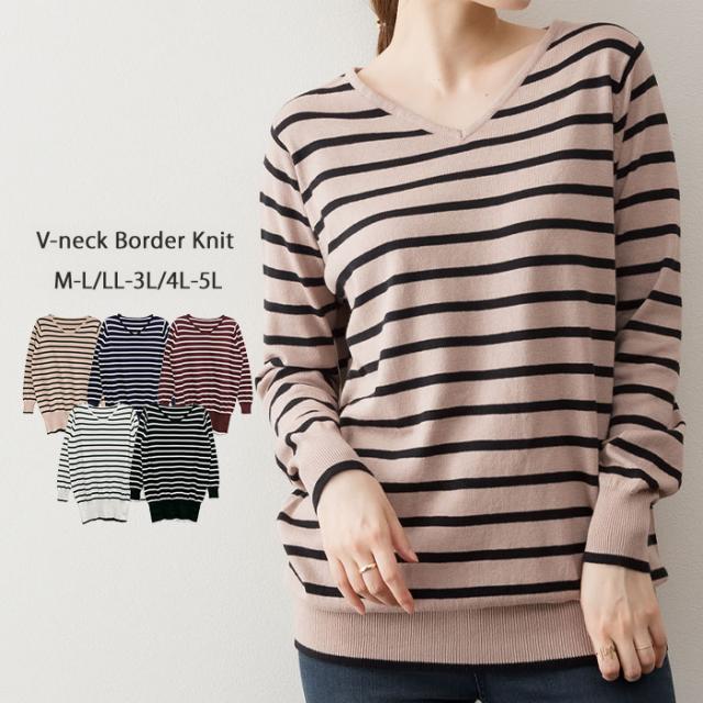 Vネックボーダーニット レディース 大きいサイズ M L LL 3L 4L5L 黒 白 ネイビー バーガンディ グレーベージュ