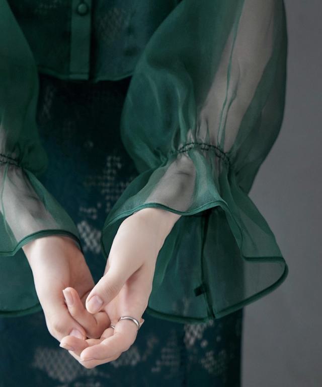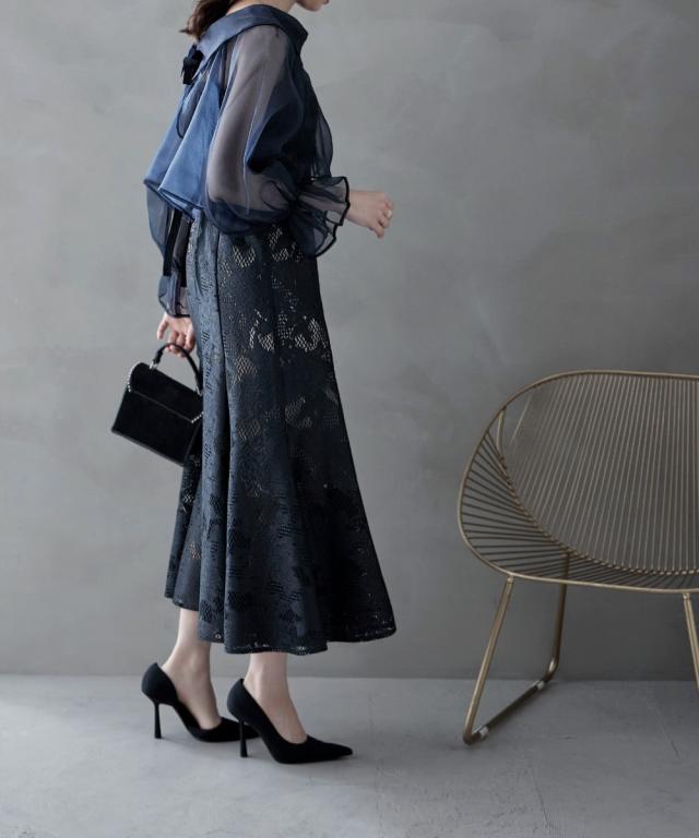 袖コンシャスなシアーブラウスはゆったりとしたシルエットとバックリボンで女性らしく、どことなくモードな雰囲気を漂わせます。