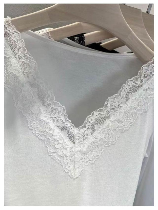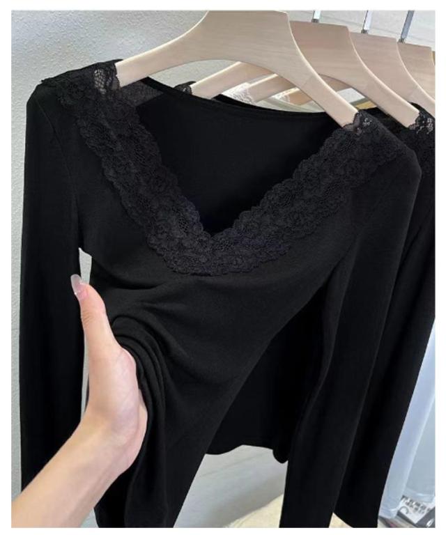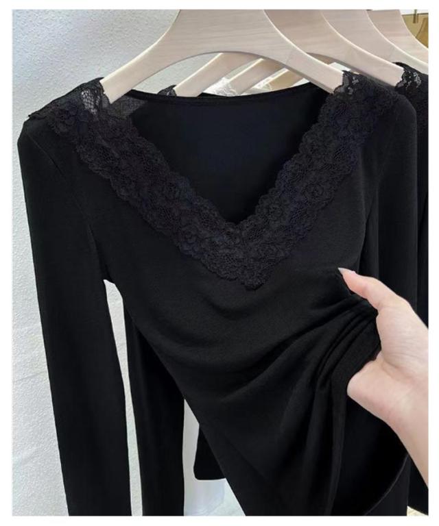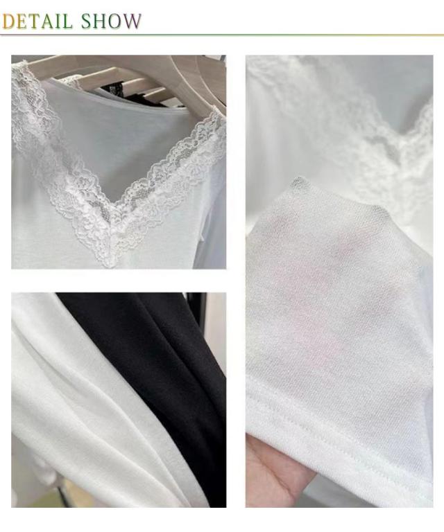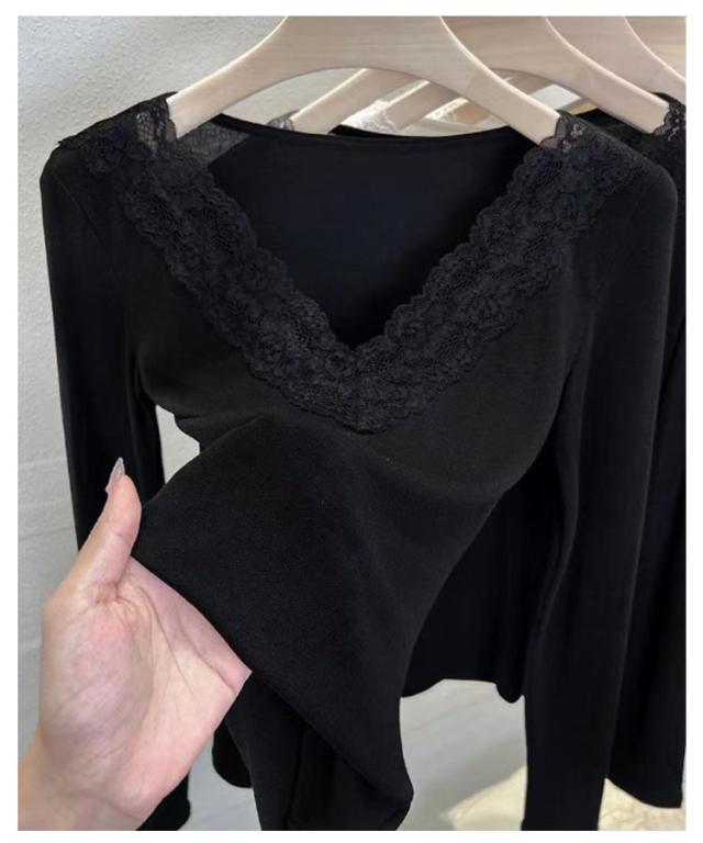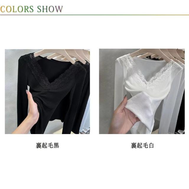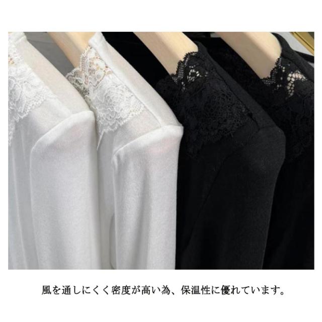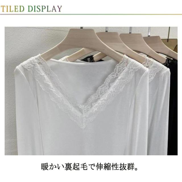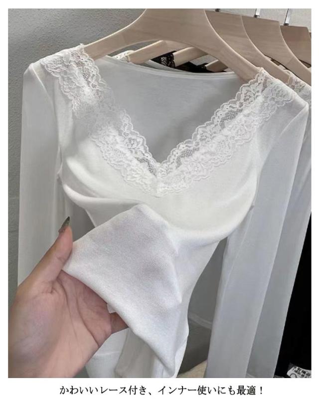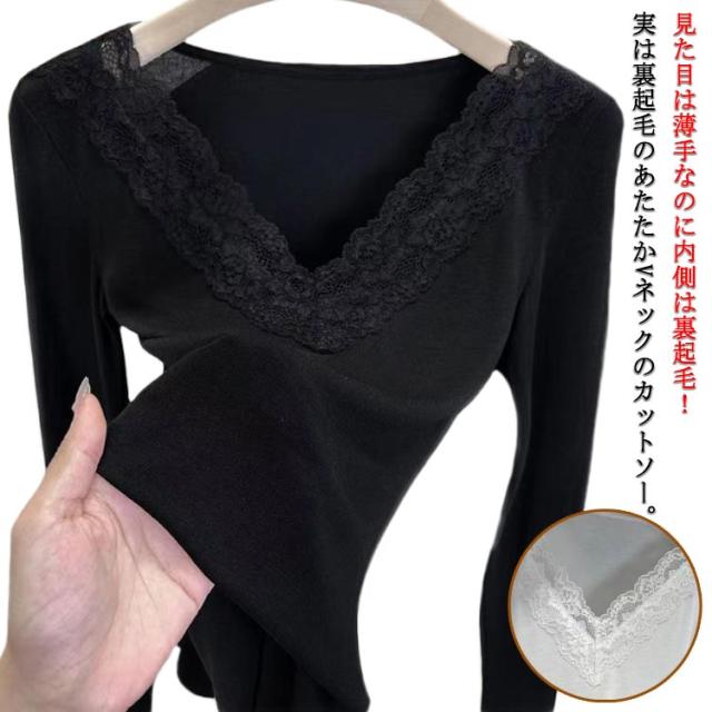 肌着 花柄レース フラワーレース レース付き XL レディース Vネック 大人 カットソー 長袖 レースインナー トップス インナー 下着 裏起毛あり ブラック 黒 ホワイト 白 M L 送料無料