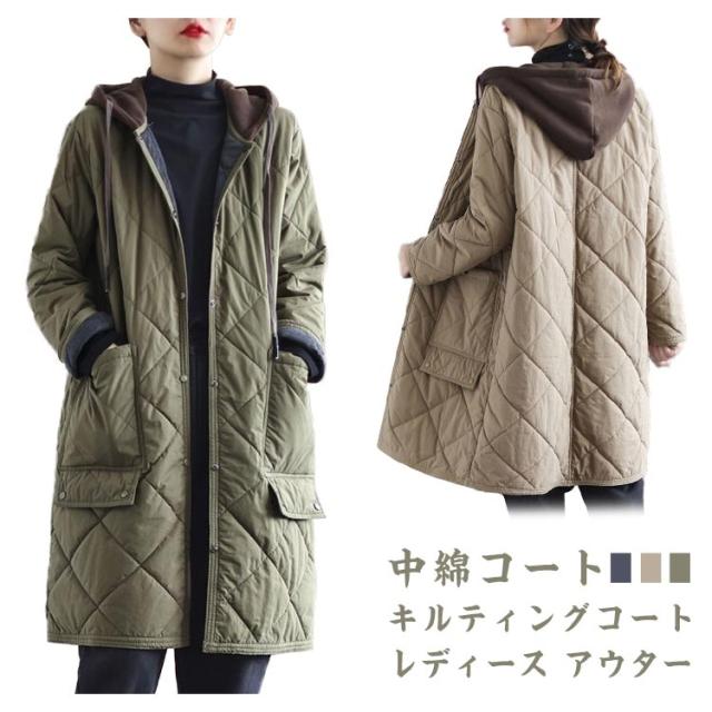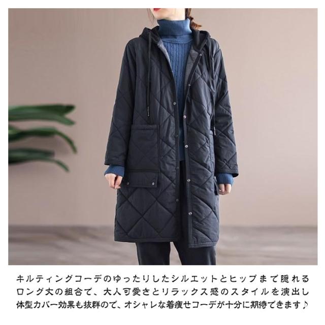 中綿コート キルティングコート レディース アウター ロングコート フード付き ジャケット 冬 無地 防寒 中綿入り 軽量 暖かい カーディガン ゆったり 大きいサイズ 体型カバー カジュアル