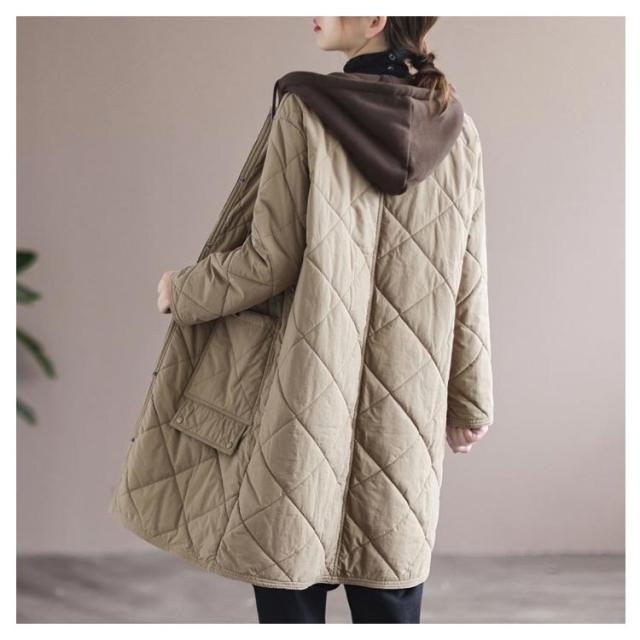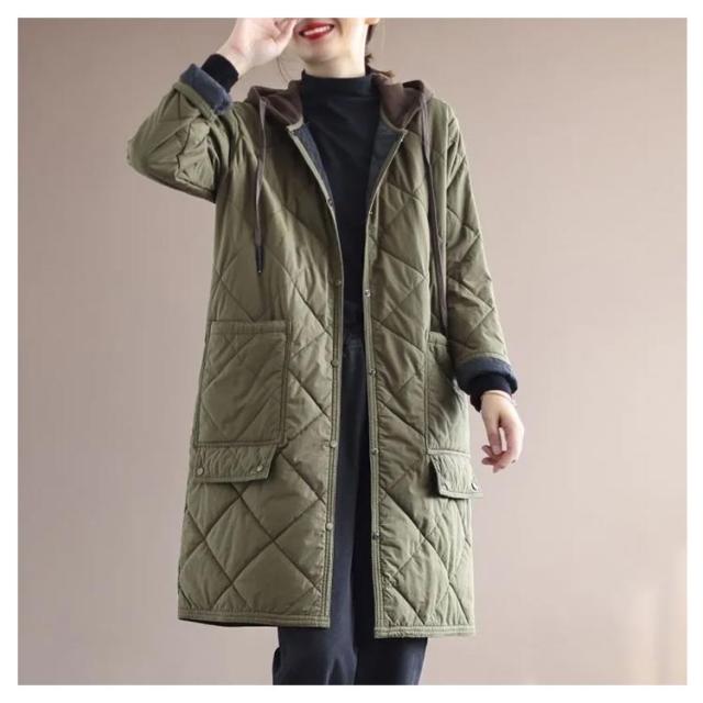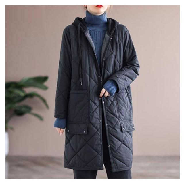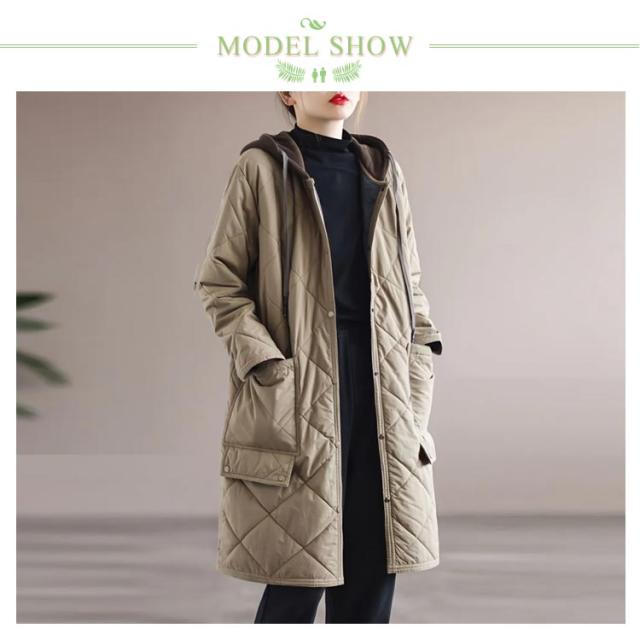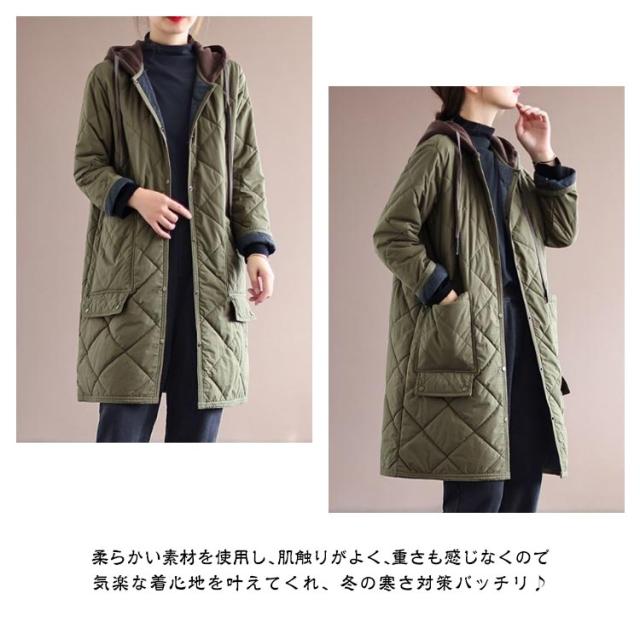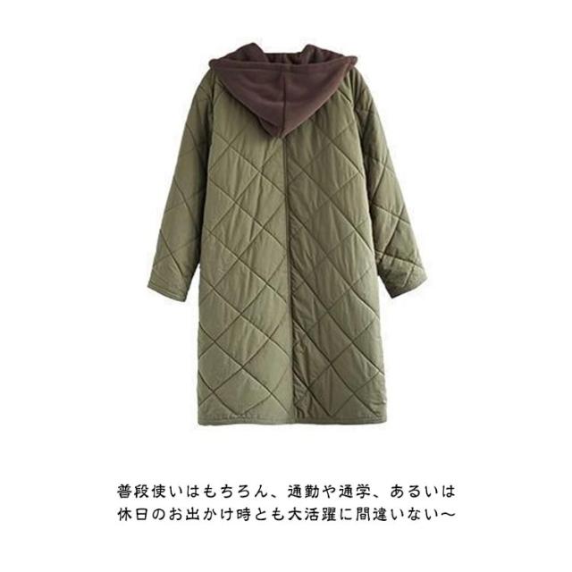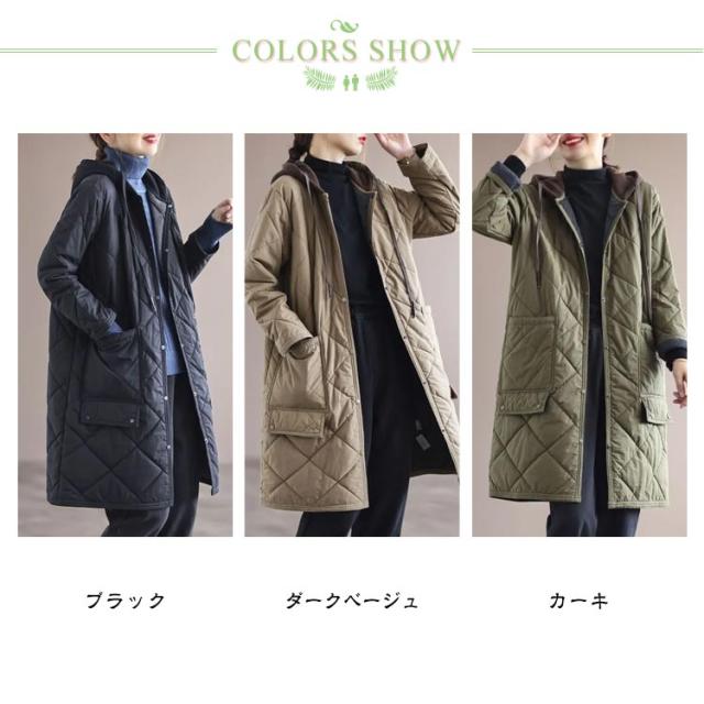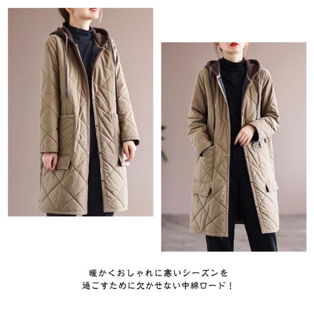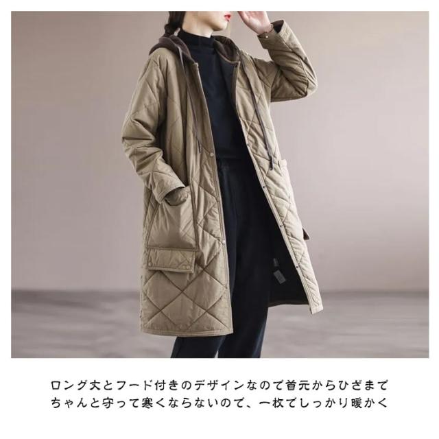 | 暖かくおしゃれに寒いシーズンを過ごすために欠かせない中綿ロード! ロング丈とフード付きのデザインなので首元からひざまでちゃんと守って寒くならないので、一枚でしっかり暖かく。 キルティングコーデのゆったりしたシルエットとヒップまで隠れるロング丈の組合で、大人可愛さとリラックス感のスタイルを演出し、体型カバー効果も抜群ので、オシャレな着痩せコーデが十分に期待できます♪ 柔らかい素材を使用し、肌触りがよく、重さも感じなくので、気楽な着心地を叶えてくれ、冬の寒さ対策バッチリ♪ 普段使いはもちろん、通勤や通学、あるいは休日のお出かけ時とも大活躍に間違いない〜 | |