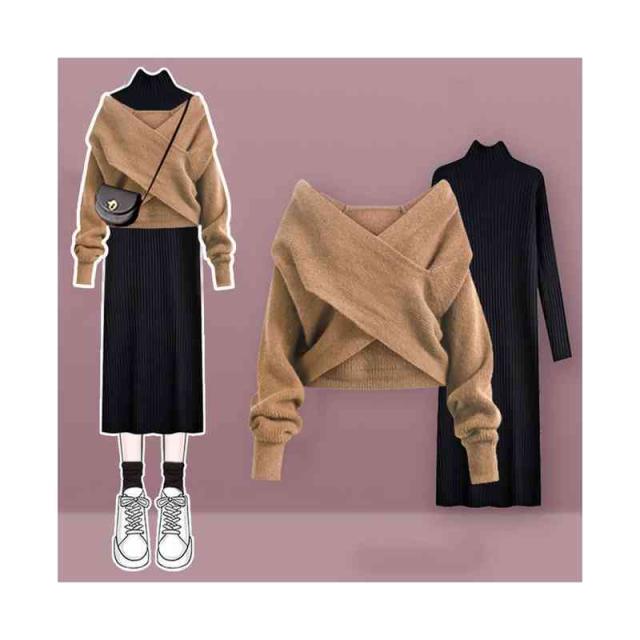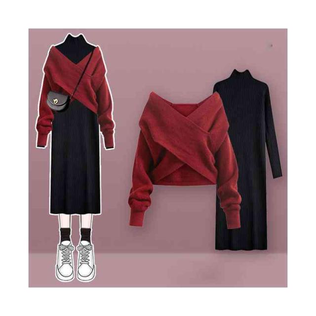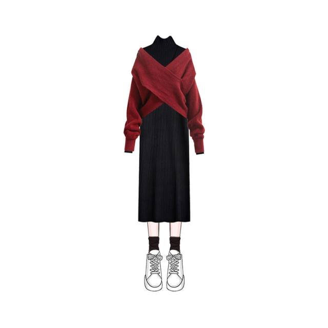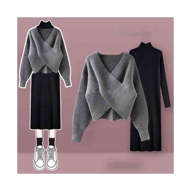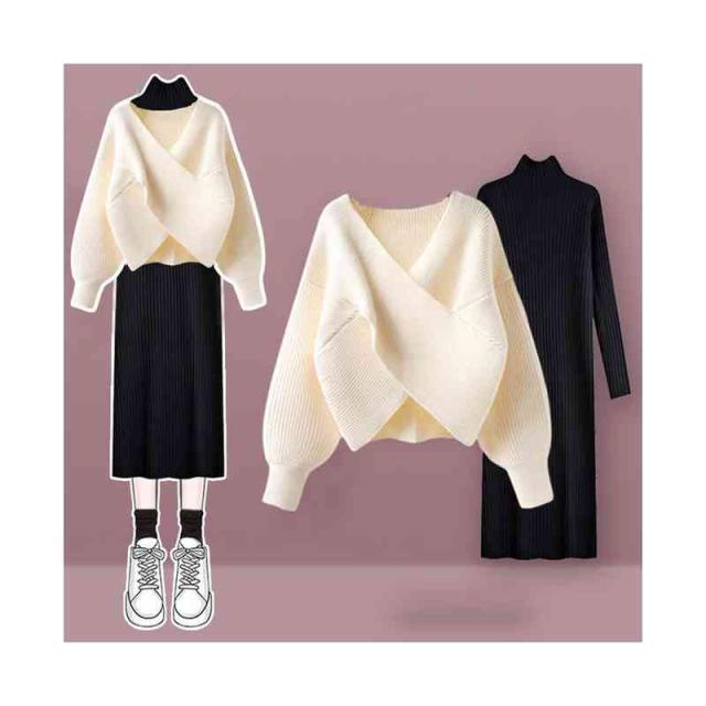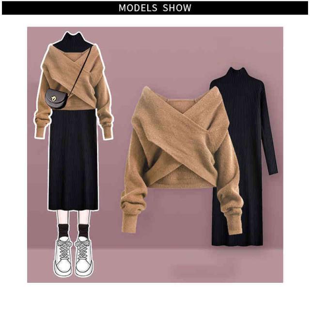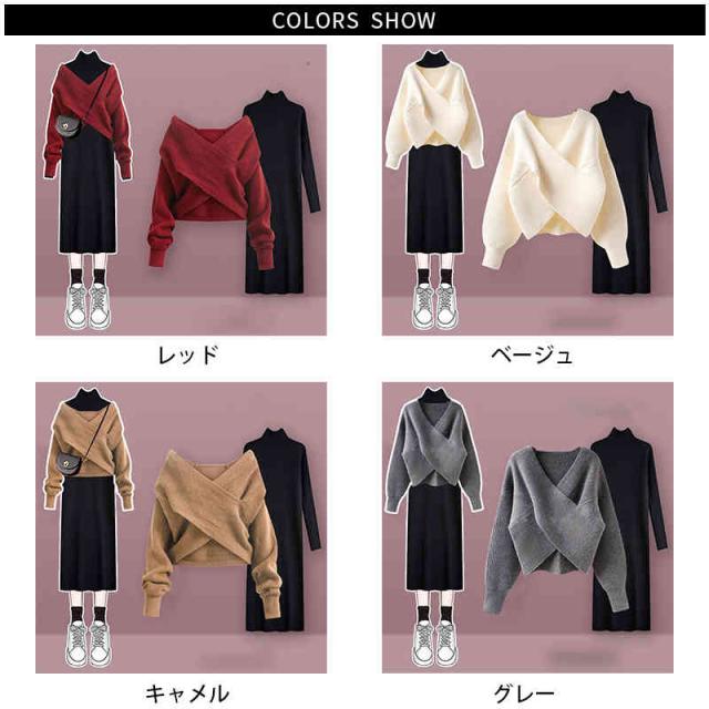 送料無料 2点セット クロスニット+ニットワンピース 上下セット セットアップ レディース 長袖 セーター タートルネック トップス ロング丈 女性 通勤 通学 カジュアル きれいめ 秋 無地 M~4XL