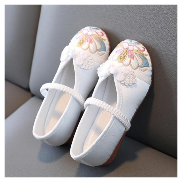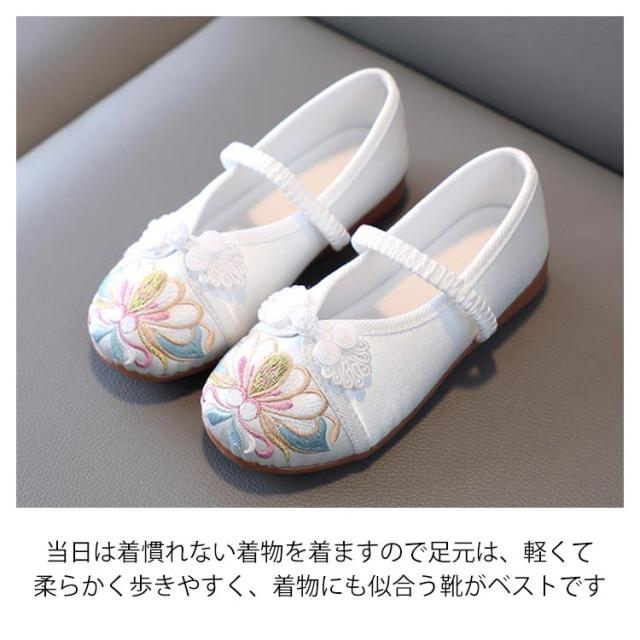 | 刺繍された可愛い靴です。当日は着慣れない着物を着ますので足元は、軽くて柔らかく歩きやすく、着物にも似合う靴がベストです。 七五三の女の子の3歳の時には三つ身の被布着物を着ますが、まだまだ小さいので履きなれない草履を嫌がることもあります。 実際に足袋を履いて、草履を履かせてお出かけすると滑って脱げたり、躓いたり。草履で上手に歩くのはまだちょっと難しいよね、というのが本当のところです。 そこで当店は、記念になる日をご機嫌で過ごせるように和柄の靴をご用意しました。 刺繍がされていて、着物ともなじみやすく、非常に軽くて柔らかい靴ですので、神社など段差の多い場所や砂利道もへっちゃらで機嫌よく歩いてくれますよ。 七五三が終われば、飾りを取って普段の靴として履いても可愛いです。 | |