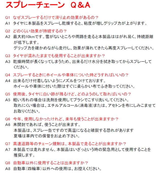 【容量】500ml【使用用途】雪道や凍結路面でタイヤがスリップするとき 【使用方法】[1]タイヤ接地面の付着物を取り除いてから、均等にスプレーして下さい。[2]10分〜20分程度乾燥を待って、 ゆっくりと発進して30km/h以下で走行をして下さい。[3]時速30km/h以下走行で約10?効果が持続します。雪道以外を走行されますと効果が早く薄れてしまいますので、再度スプレーしてください。