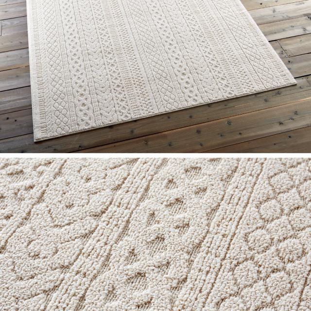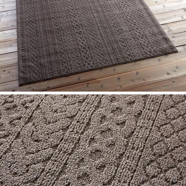 素敵なカフェのような空間になる、ナチュラルカラーのラグ。ケーブル編みのようなニット柄がほっこり暖かい気持ちにしてくれます。