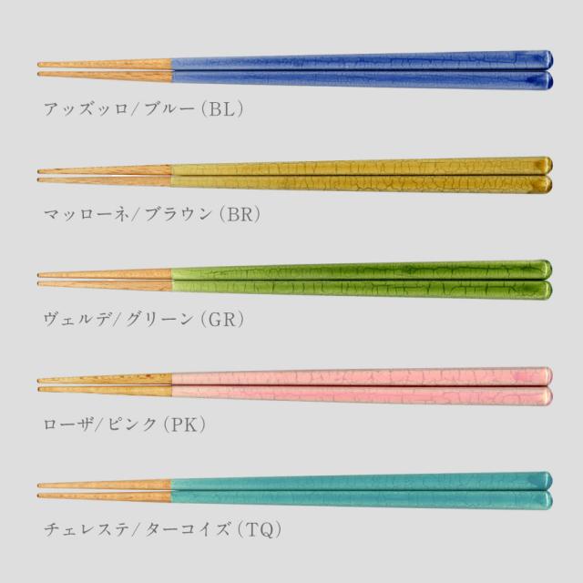 アッズッロ/ブルー(BL)、マッローネ/ブラウン(BR)、ヴェルデ/グリーン(GR)、ローザ/ピンク(PK)、チェレステ/ターコイズ(TQ)からお選びいただけます。