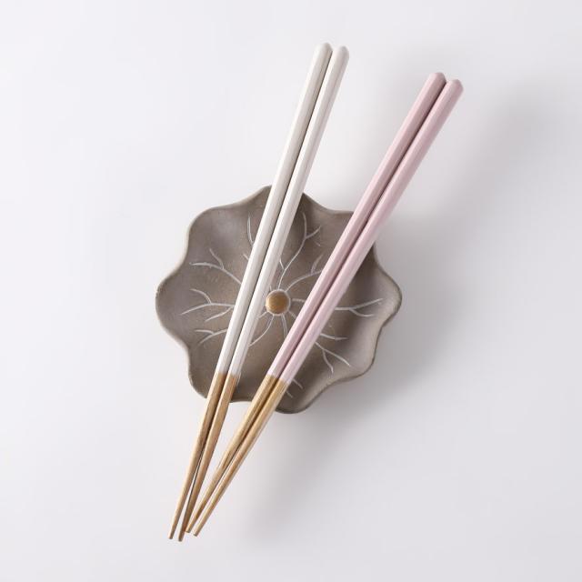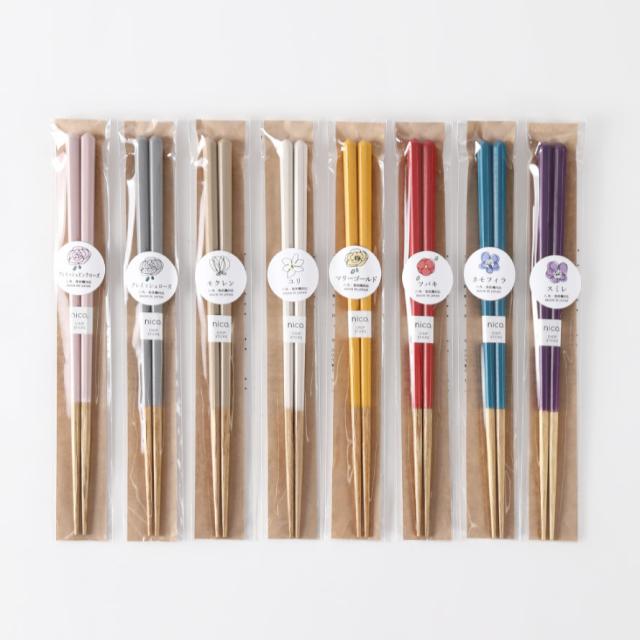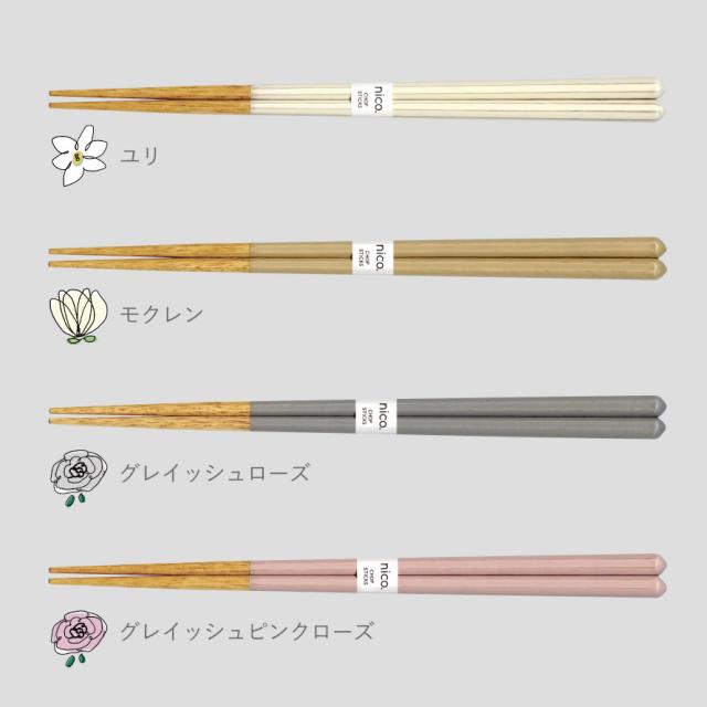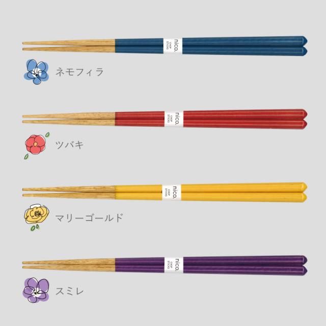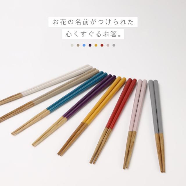 箸先の天然木らしい自然な色と、お花の名前が可愛らしい、上品なカラーの組み合わせ。