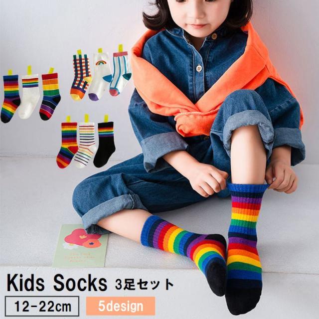 クルーソックス 靴下 3足セット キッズ ベビー 子供用 男の子 女の子 レインボー ボーダー柄 チェック柄 通園 通学 おしゃ