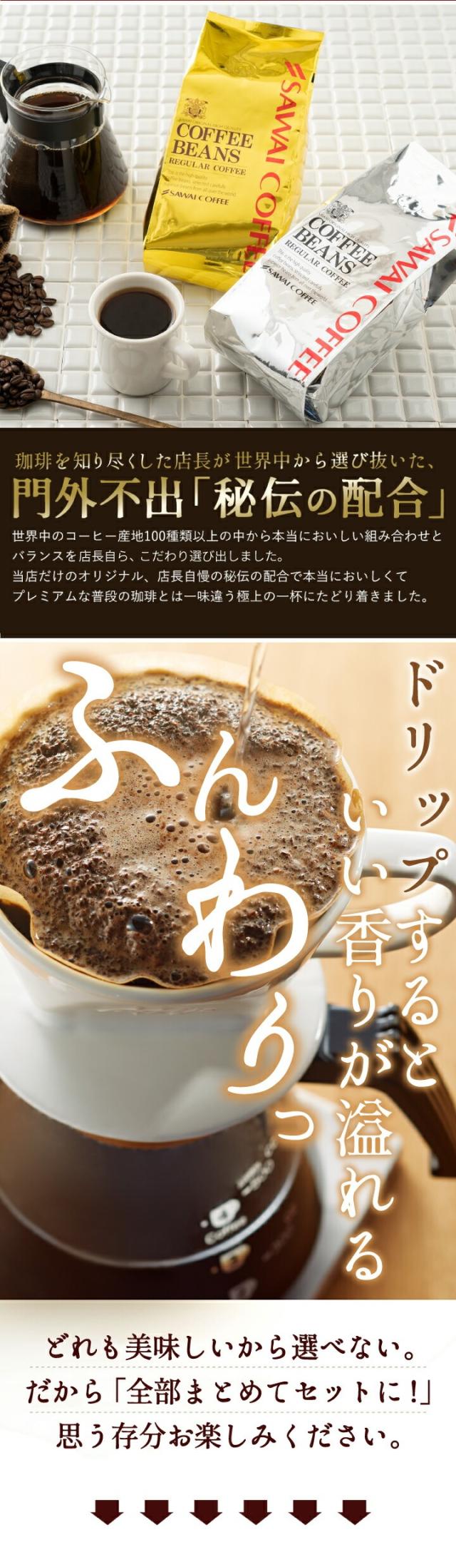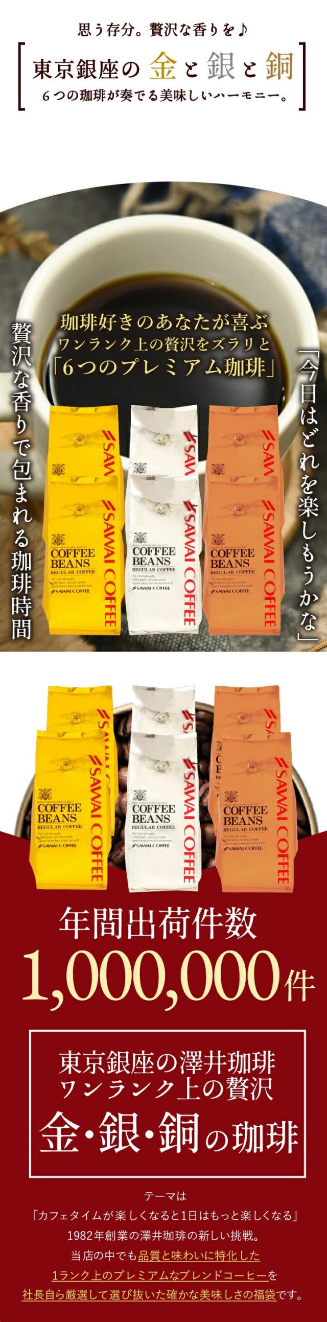 澤井珈琲(さわいこーひー)では、お客様のお家に商品が届き、箱を開けた瞬間。そして、トレードマークの赤いコーヒー袋の封を開けた時に鮮度抜群の「香り高さ」と、飲んだときの「味わい」に感動して頂けるように、レギュラーコーヒーはご注文を頂いてから焙煎をして焼きたてのコーヒー、コーヒー豆、珈琲、珈琲豆をお届けをしている焼き立て珈琲専門店です。お客様に「美味しい」と言って喜んで頂く事が私たちの喜びと思ってます。「美味しいコーヒーをお届けしたい」と想い続けて生まれたこだわりの味を、どうぞ、この機会にお楽しみくださいませ。澤井珈琲では、コーヒー豆は挽き方がご選択いただけます。珈琲豆を挽く事をお楽しみ頂ける『豆のまま』や、私共の専用の特注サイズの大型のミルで挽いて、コーヒー粉の状態にしてお届けする方法がございます。中挽き、細挽き、粗挽き、荒挽きなど様々な挽き方がございますが、私共がお薦めする『店長のおすすめ挽き』にて、そのコーヒーに合った一番美味しいと思える挽き方に挽いてお届けします。東京の銀座にも実店舗を構え、都内では浅草やスカイツリーのあるソラマチにも出店。「鳥取のコーヒー屋さん」とも呼ばれてますが、空気が綺麗で自然豊かな鳥取県に焙煎工場を構え、隣接する島根県の松江市や出雲市にも実店舗がございます。顔の見えないネット通販ですが、全国11店舗を展開する安心安全な澤井珈琲は、特徴的な「赤いコーヒー袋」に入れて、全国の珈琲好きにお選び頂いてます。よく間違えられる名前として、沢井珈琲、沢井コーヒー、澤井珈琲店、澤井珈琲本店、さわいこーひー、サワイコーヒーなどがございますが、正式名称は澤井珈琲となります。