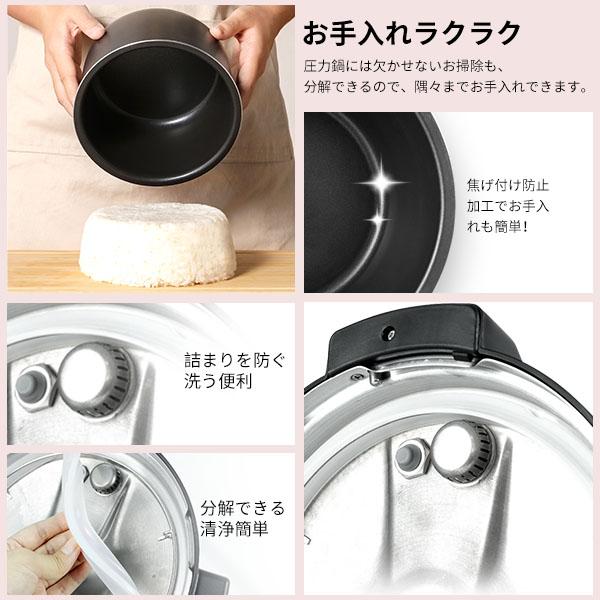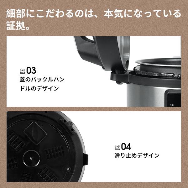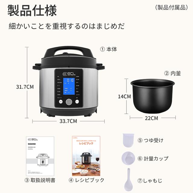 ECL電気圧力鍋は5Lと大容量にし、家族も大満足の大容量で、炊飯なら最大9合まで対応、家族5〜7人分をまとめて作るのも良し。1〜2人暮らしで作り置きして明日の分もまとめて作ってしまうも良し。大容量であることでこれまでの電気圧力鍋の簡単調理なはずなのに、何度も調理をする必要があって逆にめんどくさいという悩みを解決しました。