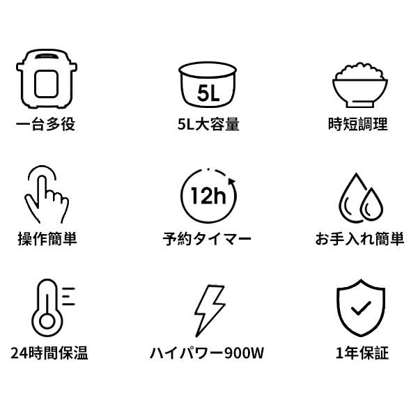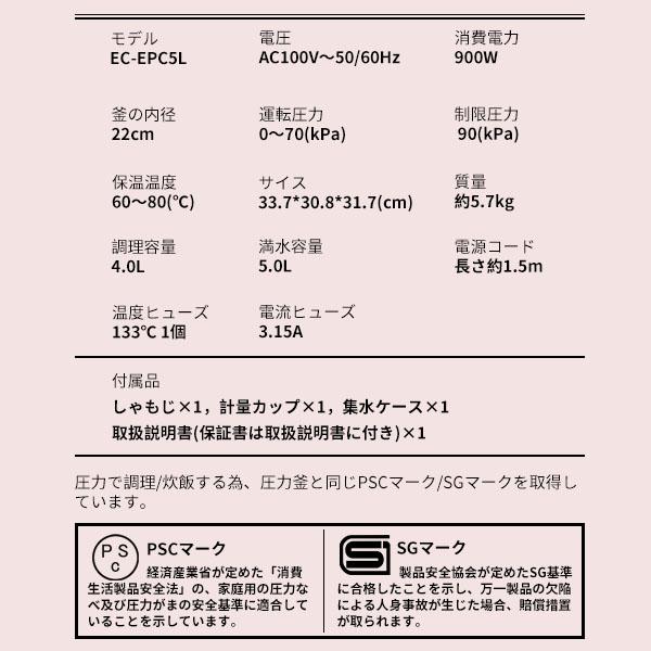 電気圧力鍋 大容量 電子圧力鍋 5L 圧力調理器 圧力鍋 電気 炊飯器 一台15役 電気鍋 自動調理鍋 蒸し/低温/スロークック/焼き調理 7つ保護機能 EC-EPC5L 圧力調理 温度調理