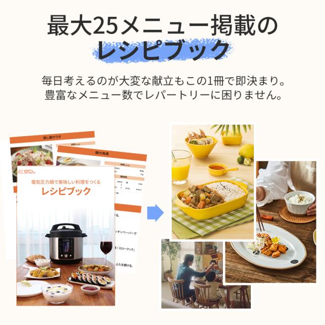 ECL電気圧力鍋1台で表面焼き、スロークック、蒸しなど5種類の調理モード、また、スープ、肉類、おかゆなど8種類の食材モードが搭載されているため、ボタン1つで簡単に作ることができ、本格料理をご自宅で楽しめます。圧力鍋には欠かせないお掃除も便利で、鍋を取り出して洗えます。一般的な圧力鍋のように重たい鍋ごとゴシゴシ洗う必要がありません。こびりつかないコーティングで洗いやすく、圧力調理がますますお手軽になります。