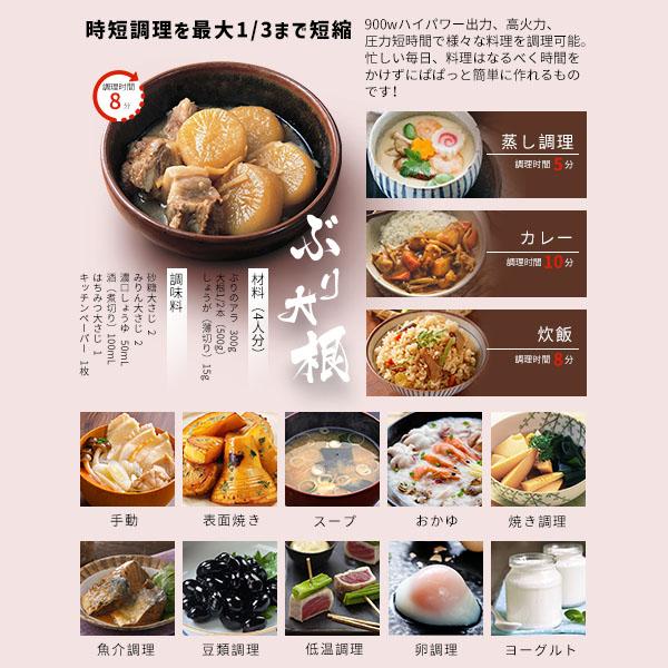 高い熱効率で、調理時間の短縮と電気使用量の削減に貢献します。忙しい毎日に、おいしいゆとりが生まれます。通常の圧力鍋のように、火加減の調整をしたり、時間を計る必要がありません。メーニューボタンで調理方法を選択後、クッキングプロが予熱から圧力調理、減圧まですべて自動で調理してくれるので、焦がしたり、吹きこぼれたり、失敗する心配がありません。圧力は強と弱と選択でき、食材の種類により、栄養のロスを抑えます。