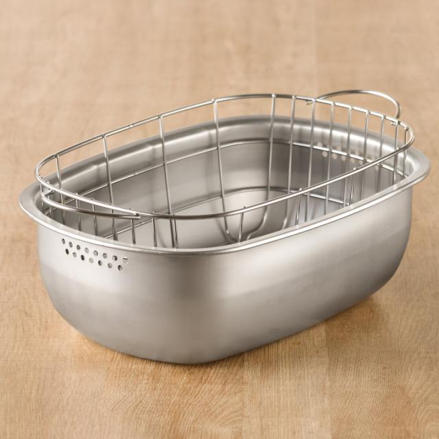 小判型の洗い桶と、すっぽり重ねられる水切りかごのセットです。水切りかごのハンドルをつかめば、かごの出し入れが簡単にでき、かごと洗い桶単体でお使いいただけます。