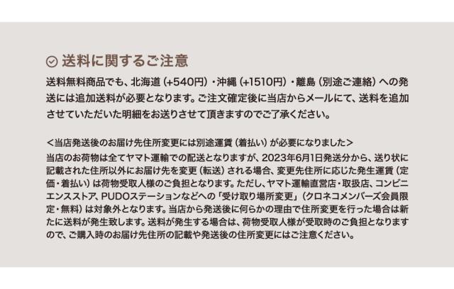 | 送料無料表示であっても、北海道(+540円)・沖縄(+1510円)への発送は追加送料が必要となります。(クレジット決済の場合は、ご注文後に追加送料をプラスして決済確定させていただきますこと予めご了承ください) ご注文確定後に追加送料を加算した金額をお知らせ致します。また、一部遠隔地域によっては、配達指定日でのお届けが難しい場合がございます。予めご了承ください。 |