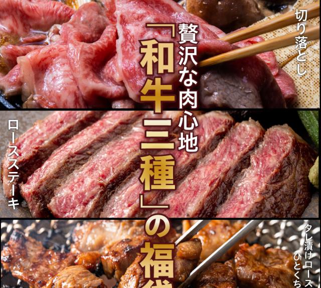 黒毛和牛三種の肉福袋 | 和牛切り落とし400g / 和牛ロースステーキ300g / 和牛タレ漬けロースひとくちステーキ400g