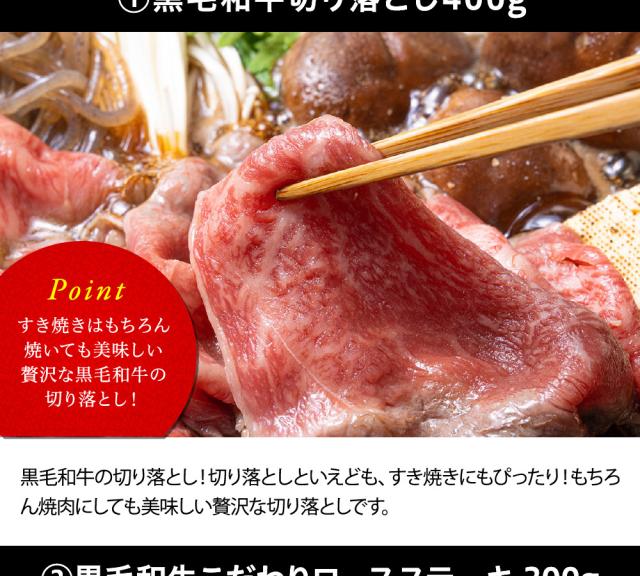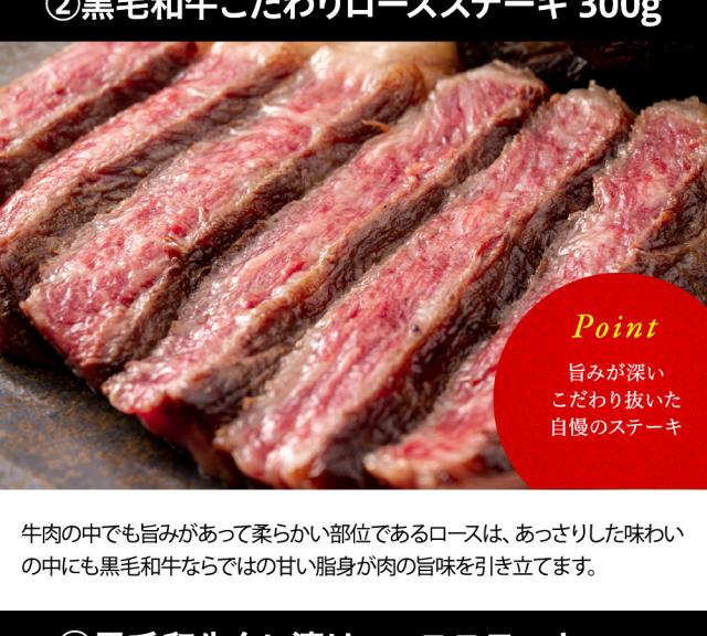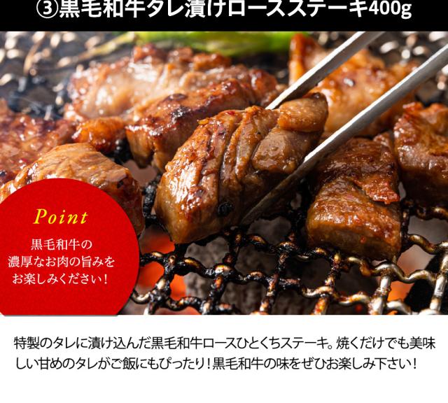 | ●黒毛和牛切り落とし400g ●黒毛和牛こだわりロースステーキ 300g ●黒毛和牛タレ漬けロースひとくちステーキ400g |