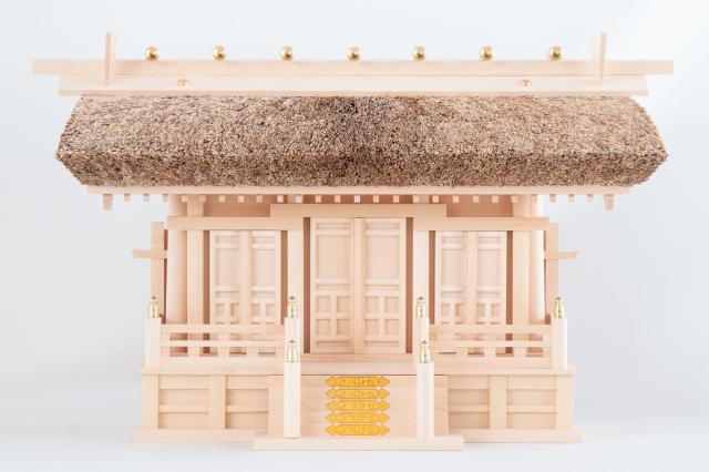 「ススキ、ヨシ、イネ」などを束ね、重ね、切りそろえて丁寧に時間をかけて作られる茅葺き屋根。日本の風土に息づく建築方法をミニマムに取り入れ、お社に組み込んだ高級神棚。圧巻の存在感と神々しいたたずまい、扉も細部まで手を掛けた「唐戸扉」の仕上げとなっています。 近年流行りの「モダン神棚」ではなく、古き良き神前に手を合わせ、心を込めて柏手を。 |