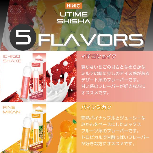 ![]() | ⇒【5本セット】HiNIC UTIME SHISHA (ハイニック ユータイム シーシャ)持ち運びシーシャ(使い捨て電子タバコ)はコチラ 新感覚♪ 吸いごたえがある持ち運びシーシャ。吸引回数は約600回となっており、需要が高い5種類のフレーバーをご用意!きっとアナタ好みの味が見つかるはず♪ |