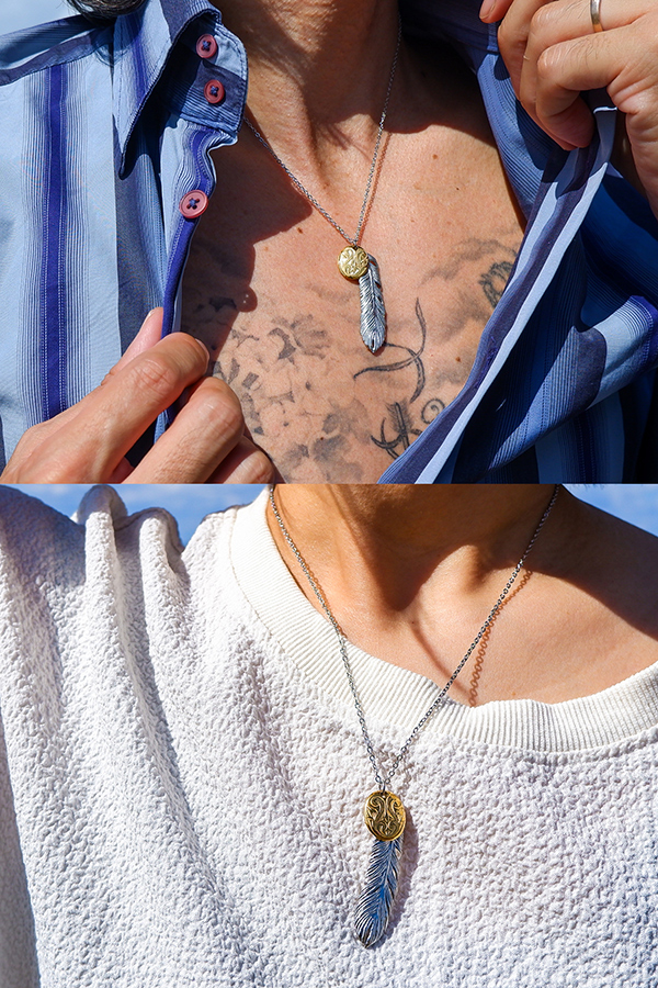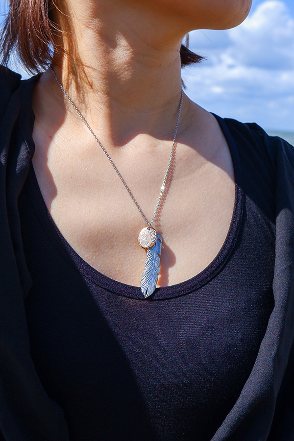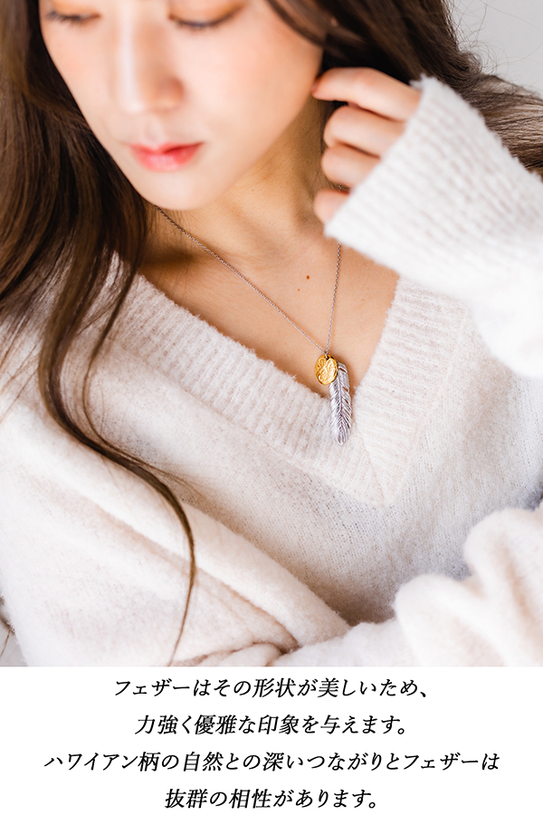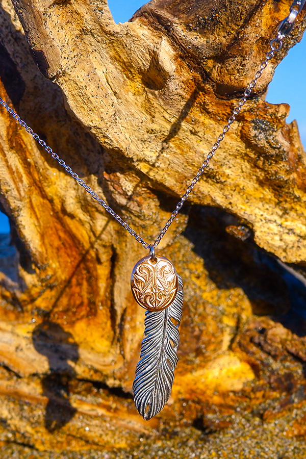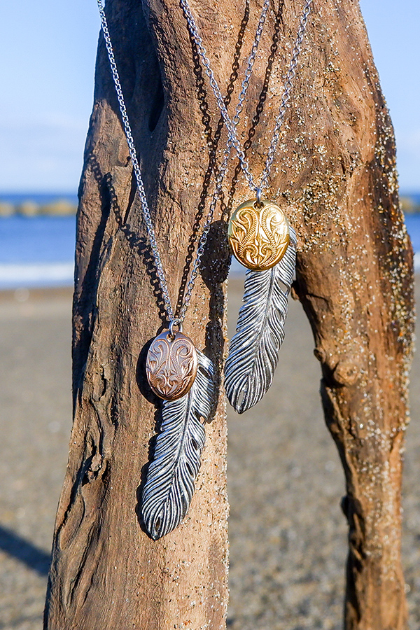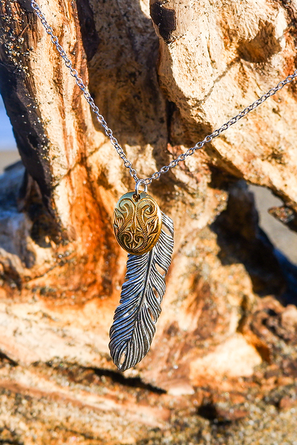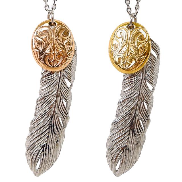スクロール(波)を刻み込んだハワイアンプレートと大きめフェザーのコンビネックレス。