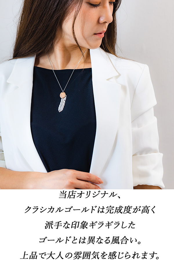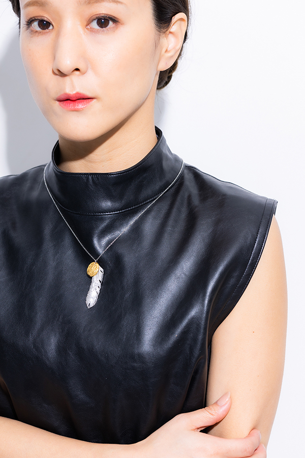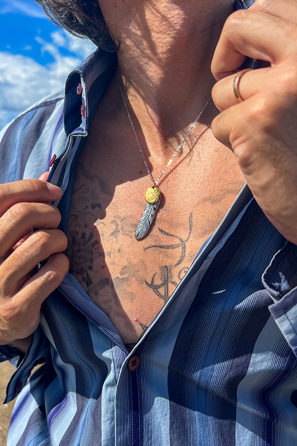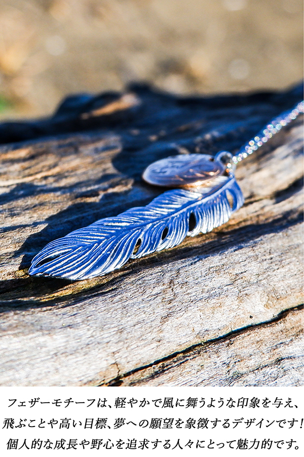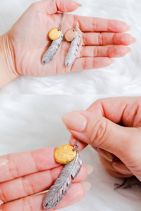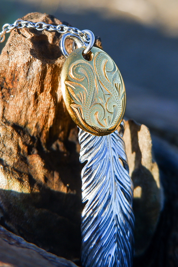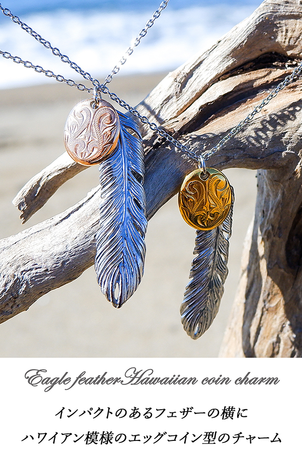 スクロール(波)を刻み込んだハワイアンプレートと大きめフェザーのコンビネックレス。