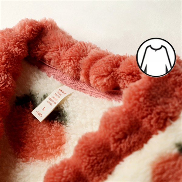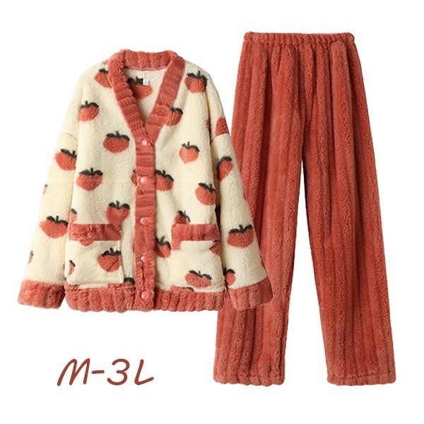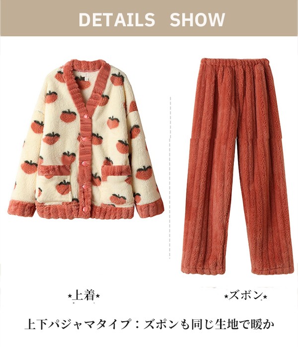 ルームウェア レディース 苺柄 イチゴ柄 長袖 冬 可愛い ふんわり もこもこ パジャマ ボア 防寒 保温 中厚手 暖かい トップス パンツ 上下セット 2点セット 部屋着 ゆったり 前開き 起毛 ロングパンツ ウエストゴム リラックス ギフト レッド k8018d7d7zr