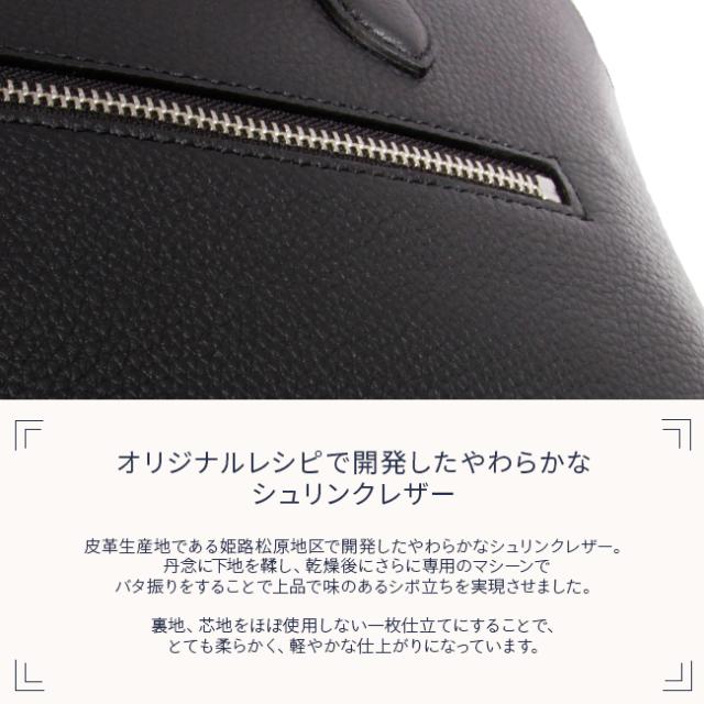 | コンパクトなサイズ感のブガッティバッグ。上品でいてエレガントな表情を見せるデザインです。内装のクッションポケットはipadが入るベストサイズです。ショルダーストラップ付なので、ハンドル持ちと斜め掛けが可能な2WAY仕様。 皮革生産地である姫路松原地区で開発したシュリンクレザー。裏地、芯地をほぼ使用しない一枚仕立てにすることで、とても柔らかく軽やかな仕上がりになっています。 |