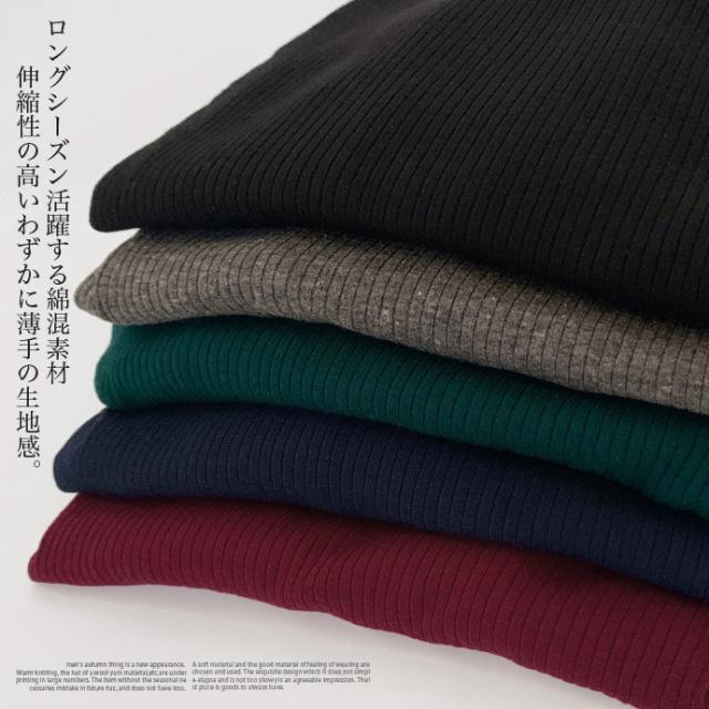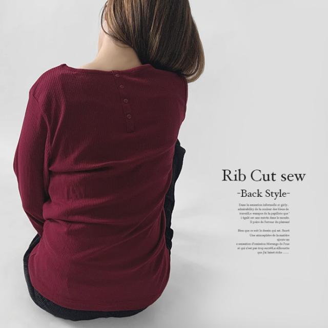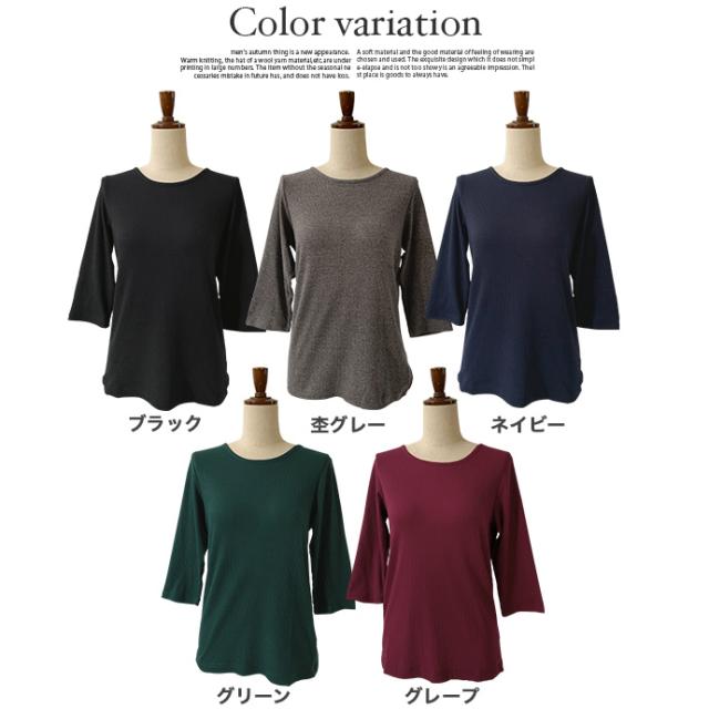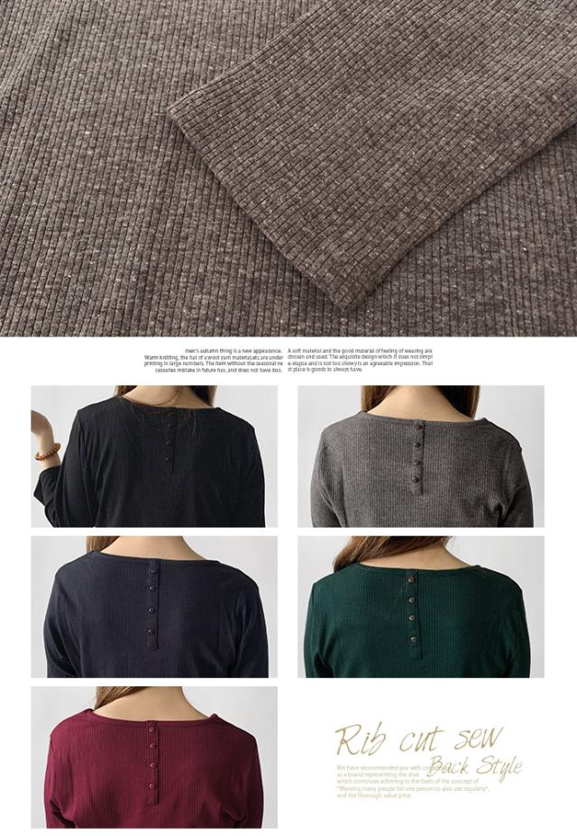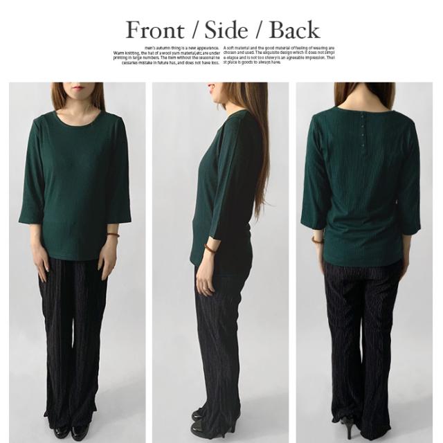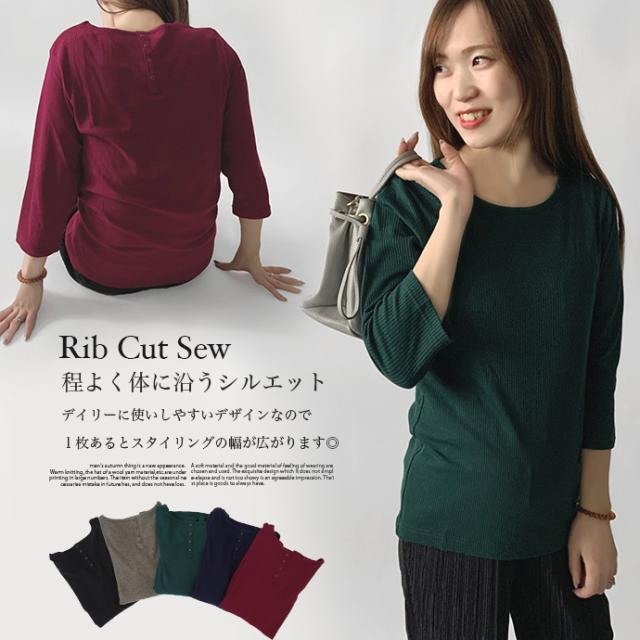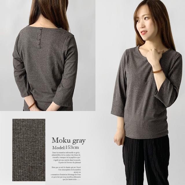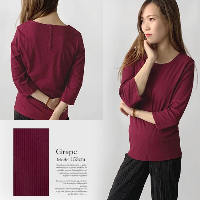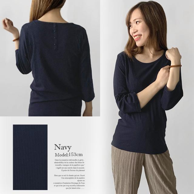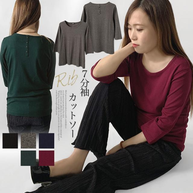 カットソー トップス 7分袖 七分袖 テレコ リブ Uネック 綿混 ストレッチ バック 飾り ボタン シンプル カジュアル オフィス ビジネス 送料無料