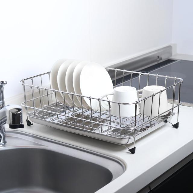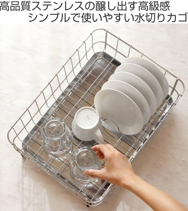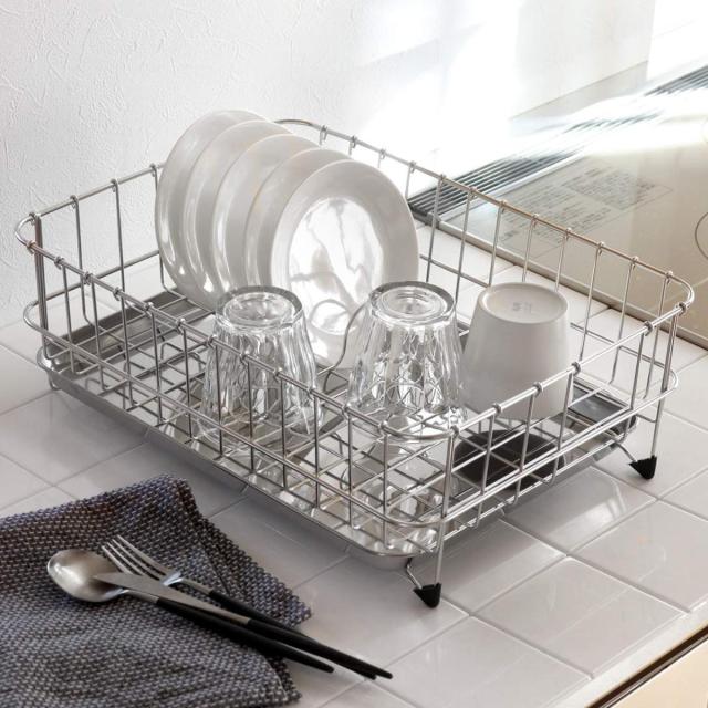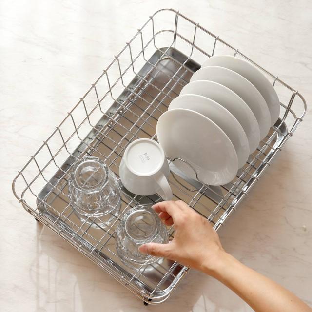 たっぷりの食器の水切りができるステンレス製の水切りカゴです。一般的なサイズよりも少し大き目なので、スペースに余裕があり、風通りが良く素早く食器を乾かせます。シンプルなつくりで食器を置きやすく、見た目もすっきりとしていつも気持ちの良いキッチンを保てます。