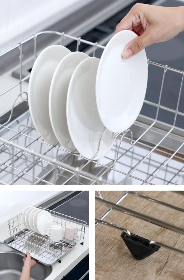 一部ワイヤーがお皿を立てられる仕切り設計となっており、5枚のお皿を立てて水切りできます。切った水は引き出し式水受けでしっかりキャッチ。また脚部にはシリコーンゴムのキャップが付いており、滑らず快適な使い心地です。