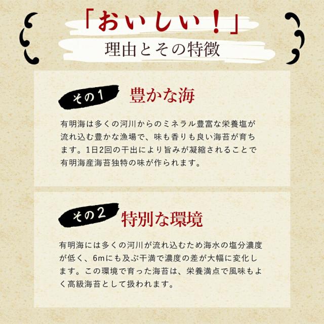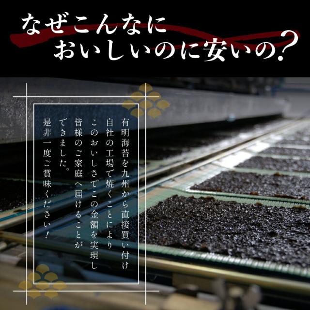 - 初めて購入しましたが、少し贅沢な気持ちで食します。 パリパリ感ありで味も良く、更に口の中にくっつく、、久々の海苔 老舗の海苔そのもののパッケージにも満足しました。