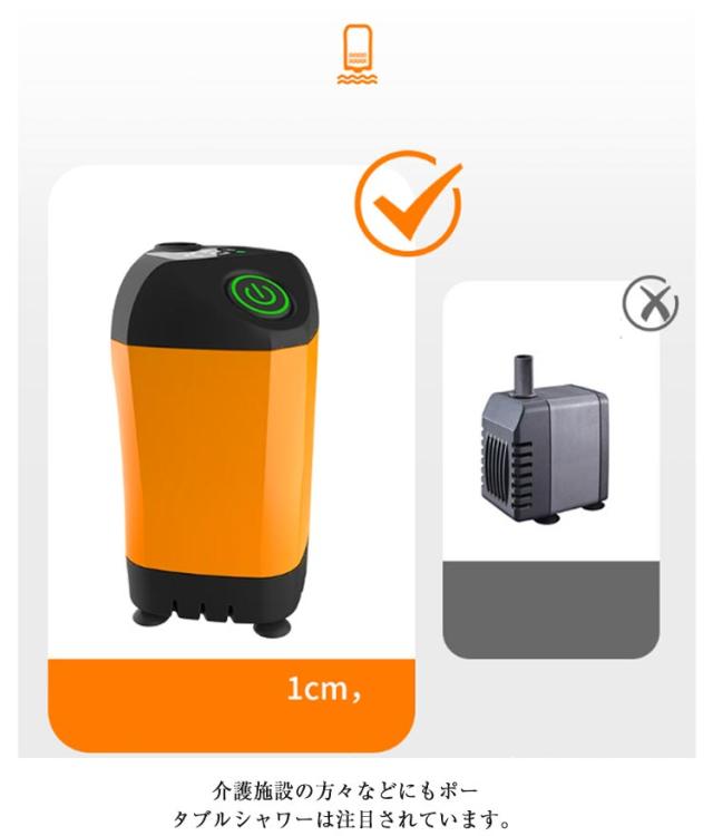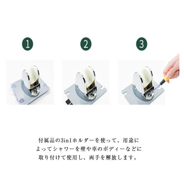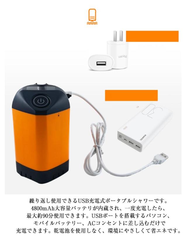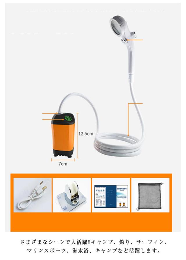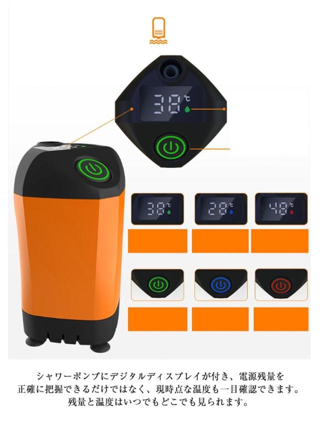 | 水道のない場所でも使える!充電式のポータブルシャワーです。 水の中にポンプを沈めるだけで、どこでも簡単にシャワーを使うことができます!! さまざまなシーンで大活躍!!キャンプ、釣り、サーフィン、マリンスポーツ、海水浴、キャンプなど活躍します。 レジャー以外でも日常の洗車や災害の非常時などでも大活躍! 外出先で充電が切れてもで充電可能です。 介護施設の方々などにもポータブルシャワーは注目されています。 繰り返し使用できるUSB充電式ポータブルシャワーです。4800mAh大容量バッテリが内蔵され、一度充電したら、最大約90分使用できます。USBポートを搭載するパソコン、、ACコンセントに差し込むだけで充電できます。乾電池を使用しなく、環境にやさしくて省エネです。 シャワーヘッド固定用の吸盤が付属しています。 シャワーポンプにデジタルディスプレイが付き、電源残量を正確に把握できるだけではなく、現時点な温度も一目確認できます。残量と温度はいつでもどこでも見られます。付属品の3in1ホルダーを使って、用途によってシャワーを壁や車のボディーなどに取り付けて使用し、両手を解放します。 | |