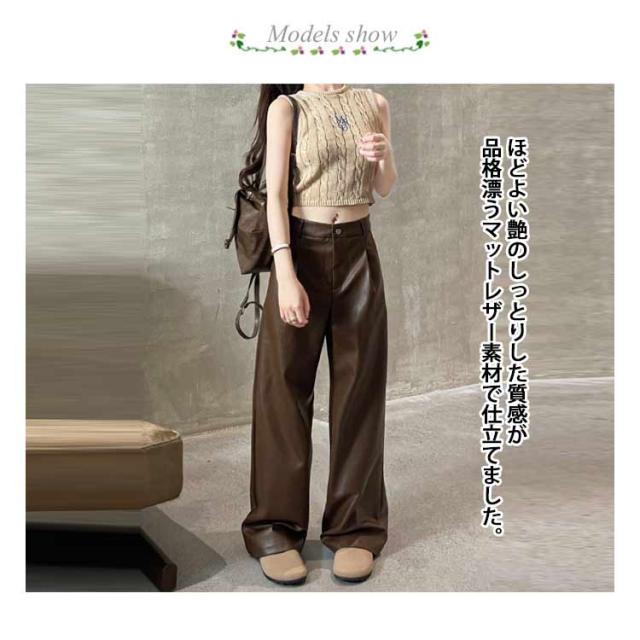 | 今季節に大ヒットなマットレザーワイドパンツ。 ほどよい艶のしっとりした質感が品格漂うマットレザー素材で仕立てました。 裾が広がり過ぎないストンと落ちるデザインで体型カバー効果&足長効果が期待出来る。 ハイウエストdesignがトップスインして、すっきりとしたシルエットを演出してくれます。 やわらかなフェイクレザーでハードすぎず、おしゃれでクールな着こなしにおすすめな1本です。 | |