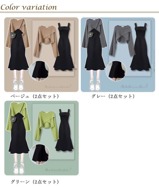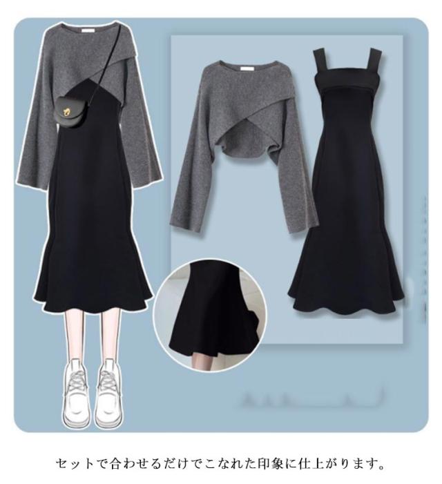 ニット セットアップ クロス セーター キャミワンピース 2点セット レイヤード 上下セット Aライン フレアワンピース リブニット 長袖 トップス ゆったり 体型カバー ワンピ 無地 フェミニン オフィス カジュアル 送料無料 秋 冬 春 秋服 春服