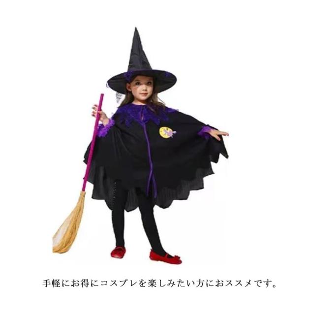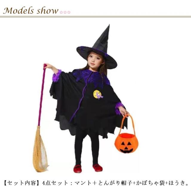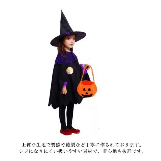 ハロウィン コスプレ 衣装 魔法使い 魔女 仮装 変装 コスチューム 4点セット 子供用 女の子 マント とんがり帽子 かぼちゃ袋 ほうき 付き キッズ 童話 演出服 パーティー イベント 文化祭 学園祭 ステージ衣装 かわいい 90 100 110 120 130 140 150