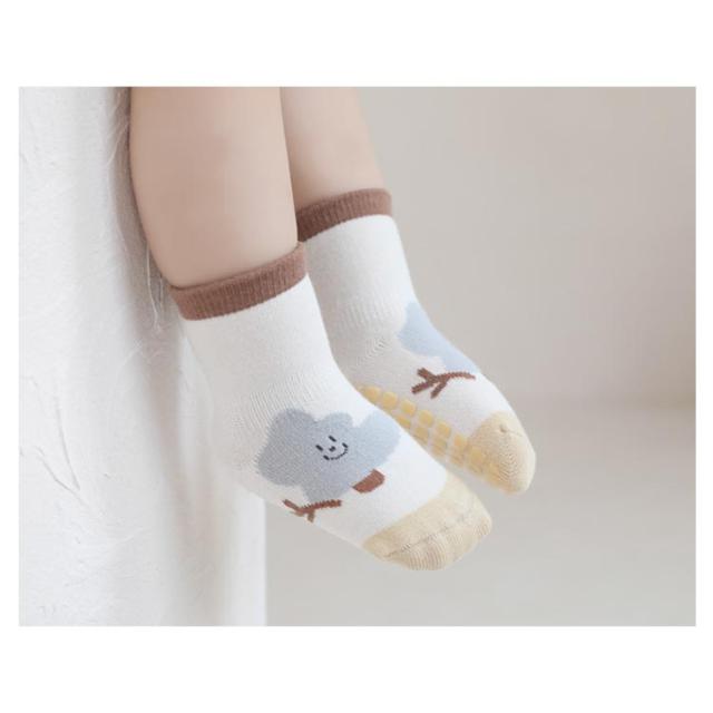 | 毎日のコーデにプラスワン♪滑り止め付きのベビーソックス。 伸縮性あり、赤ちゃんの足を優しく包み込みます。 足首には補強ゴム加工がありフィットしやすいつくりになっています。 また、つま先はチクチクしないよう縫い目があたりにくくなっています。 ちょうどよい厚さで通気性が良く、柔らかいです。 靴下の底に滑り止めシリコンが付いていて、屋内で走る時や屋外の遊び時に足を保護します。 洗濯を繰り返しても毛羽立ちにくく、たくさん履いてもくたびれにくい。長くご愛用いただけます。 何足あっても嬉しい靴下。機能性に優れた可愛いベビーソックスはプチギフトにも大変おすすめです。 | |