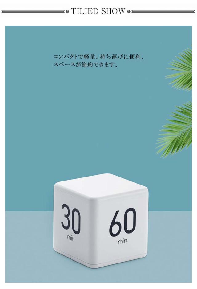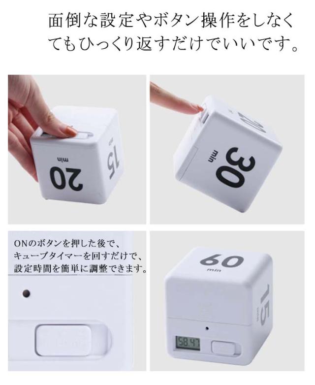 | 時間管理にとっても役立つタイマー。 面倒な設定やボタン操作をしなくてもひっくり返すだけでいいです。 ONのボタンを押した後で、キューブタイマーを回すだけで、設定時間を簡単に調整できます。 コンパクトで軽量、持ち運びに便利、スペースが節約できます。 単4形2本電池(別売)を入れるだけですぐにお使いいただけます。 | |