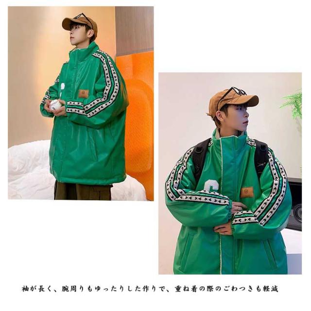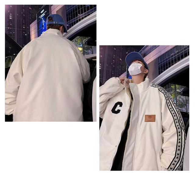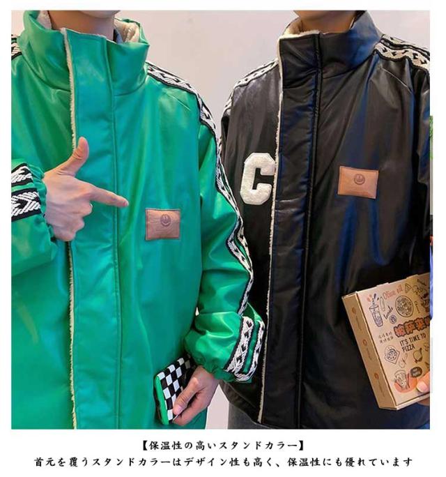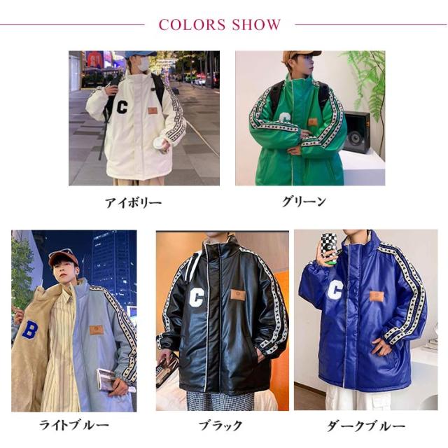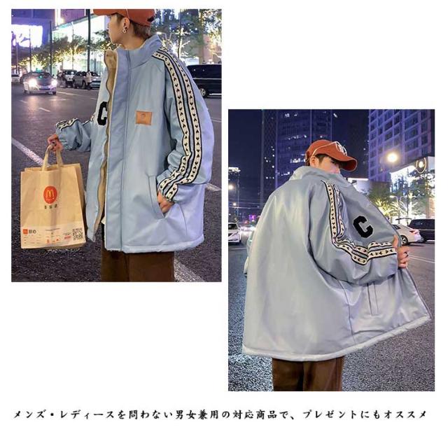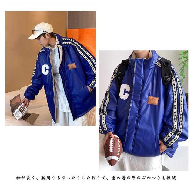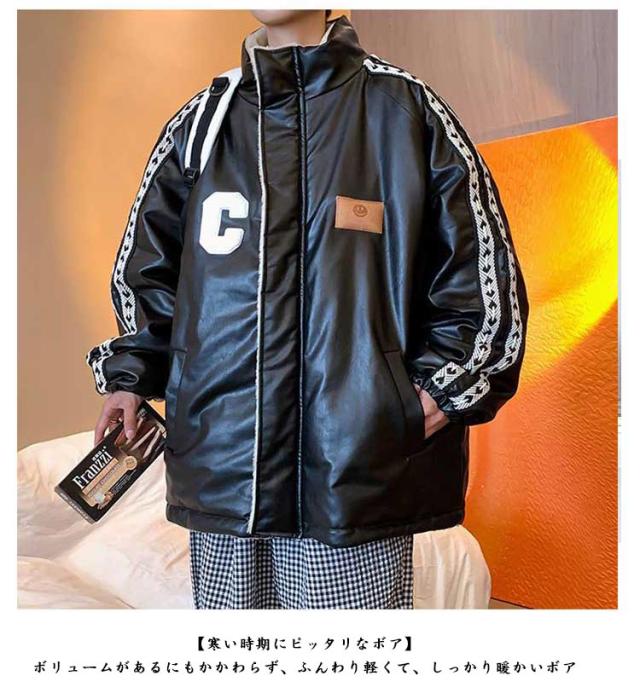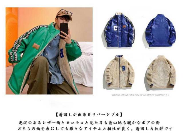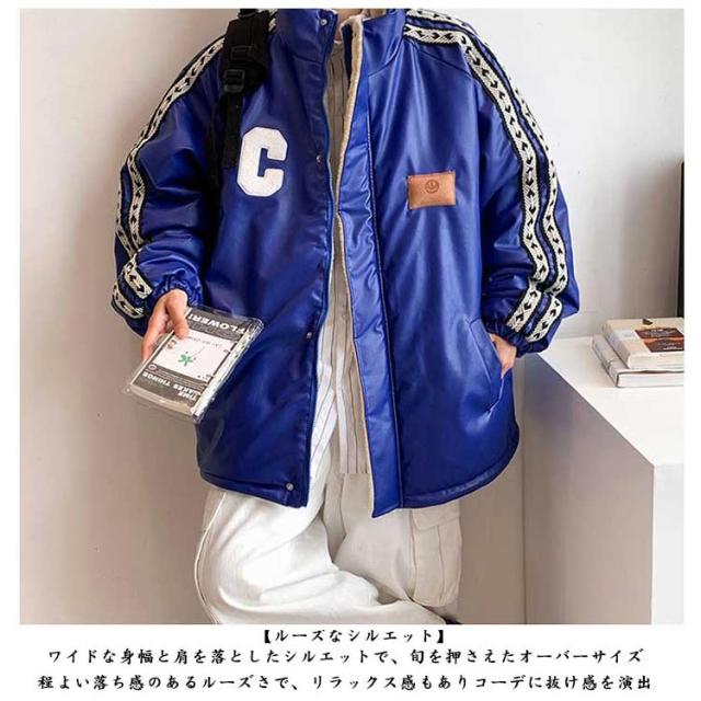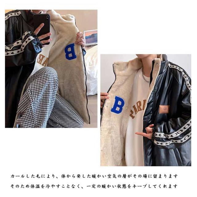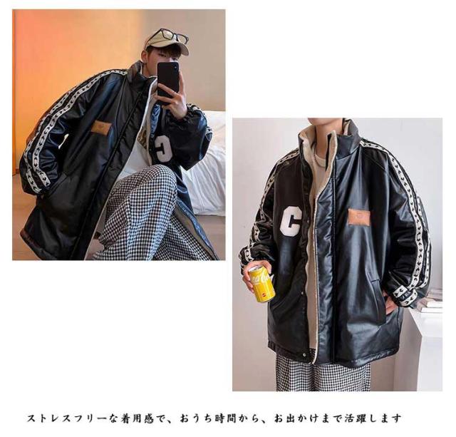 リバーシブル ボアブルゾン レザージャケット 裏ボア ジャケット リバーシブル ブルゾン ビッグシルエット ハイネック ライン入り アウター ペアルック ポケット付き ゆったり 防寒 暖かい 2WAY 無地 カジュアル シンプル